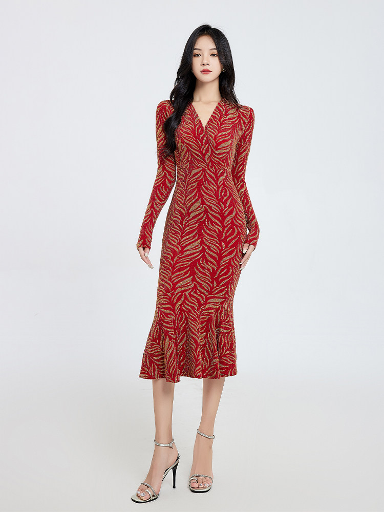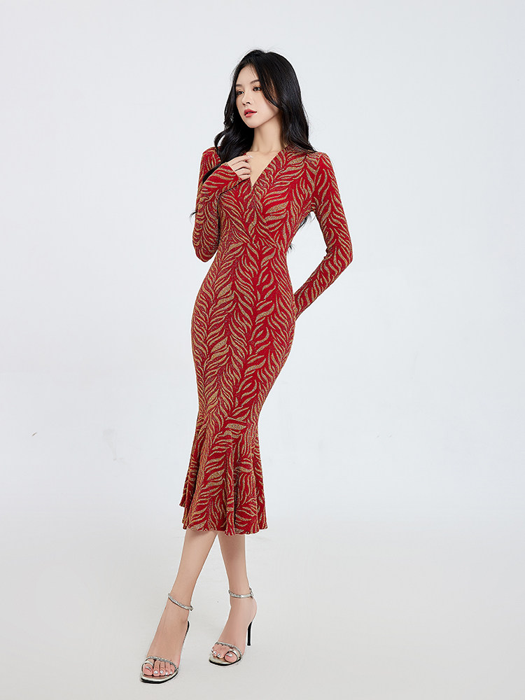 法式复古红色连衣裙女秋季长裙小香风高级感修身气质包臀鱼尾裙子