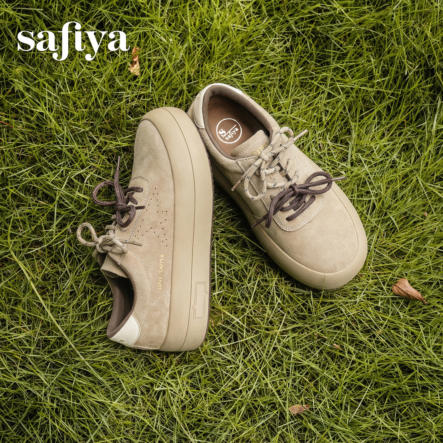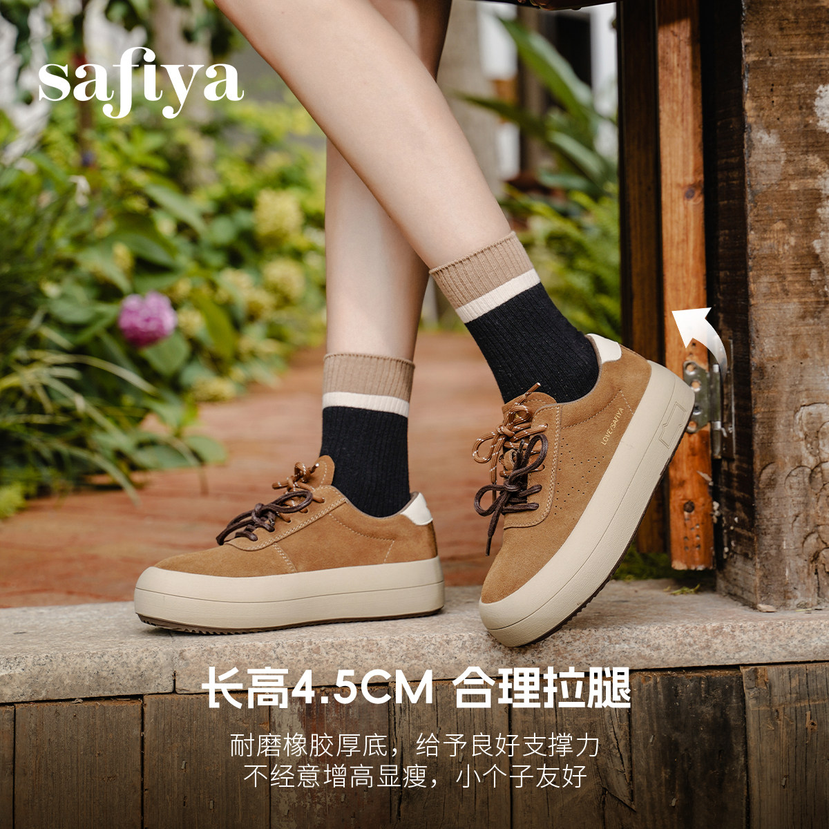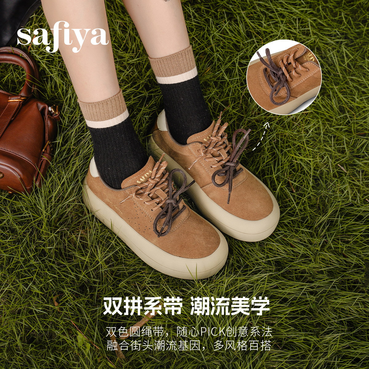 索菲娅2026春季新品复古百搭圆头系带休闲透气户外运动厚底板鞋