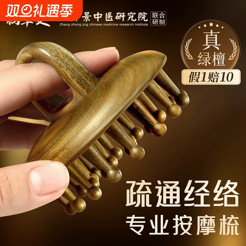 天然绿檀木圆盘按摩梳子头皮经络疏通刮痧神器便携家用防静电梳子