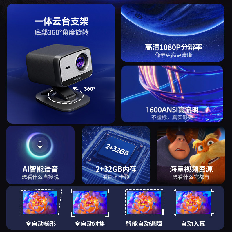 飞利浦455投影仪家用超高清电动升降幕布一体套装家庭影院客厅卧室桌面云台投影机办公会议白软画框幕便携式