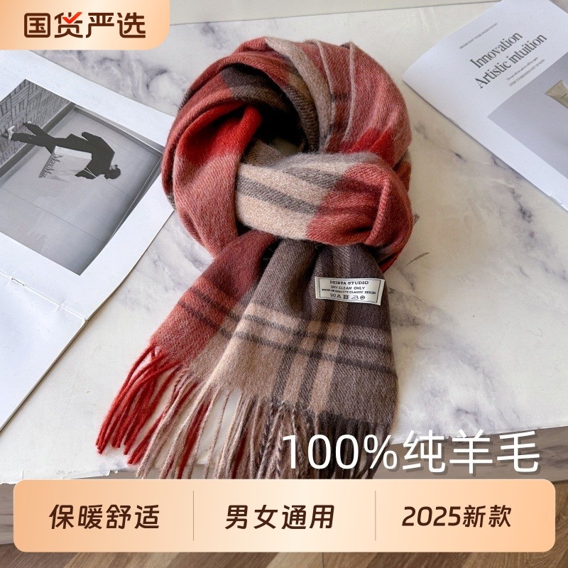 100%纯羊毛格子围巾女冬季保暖生日礼物新款英伦风绵羊毛窄版双面
