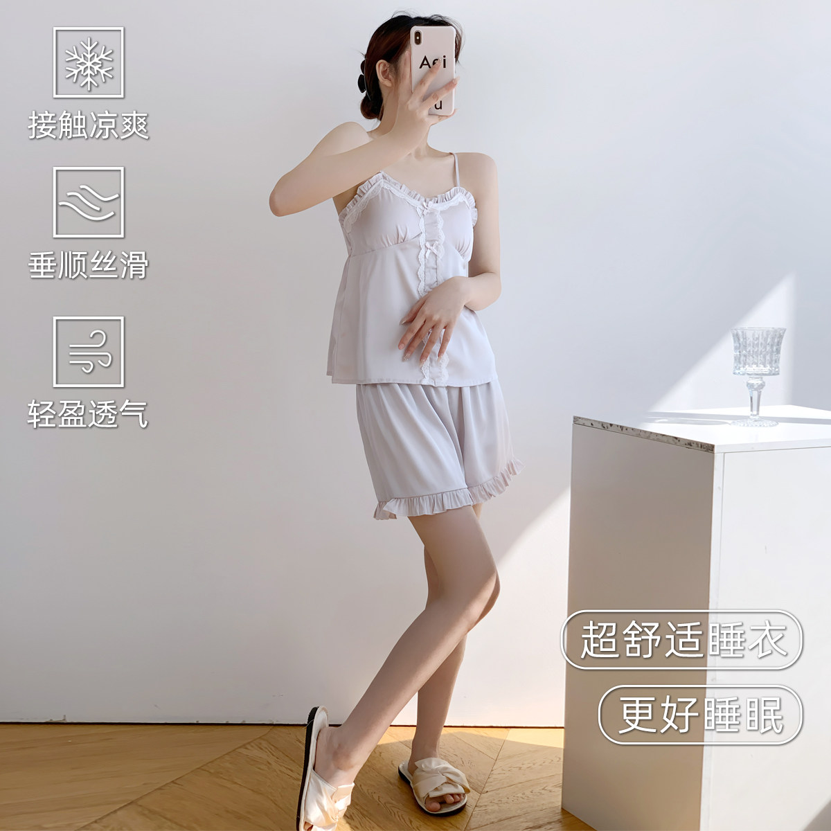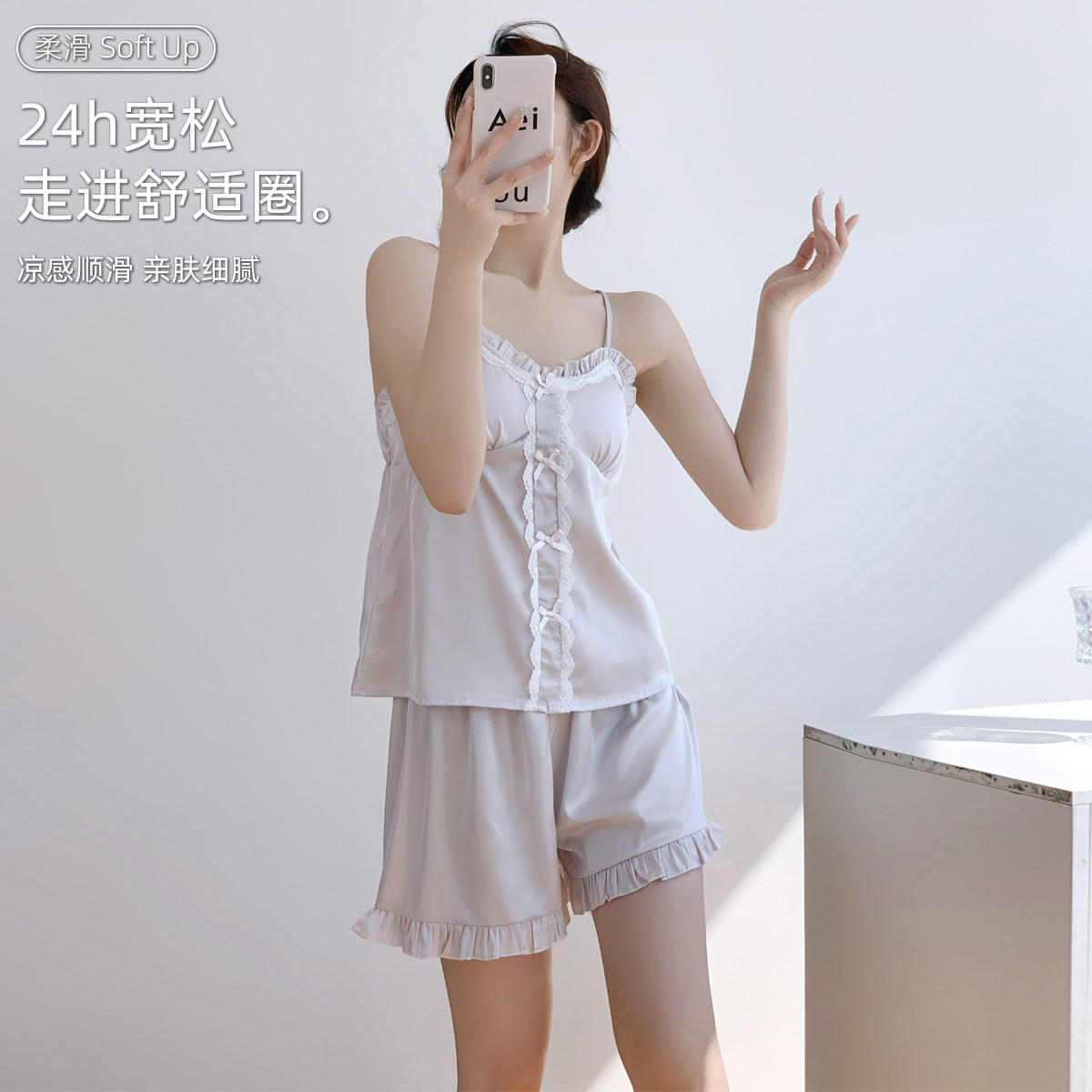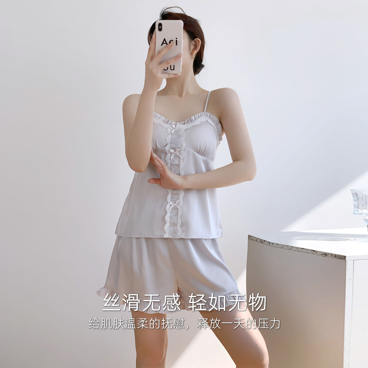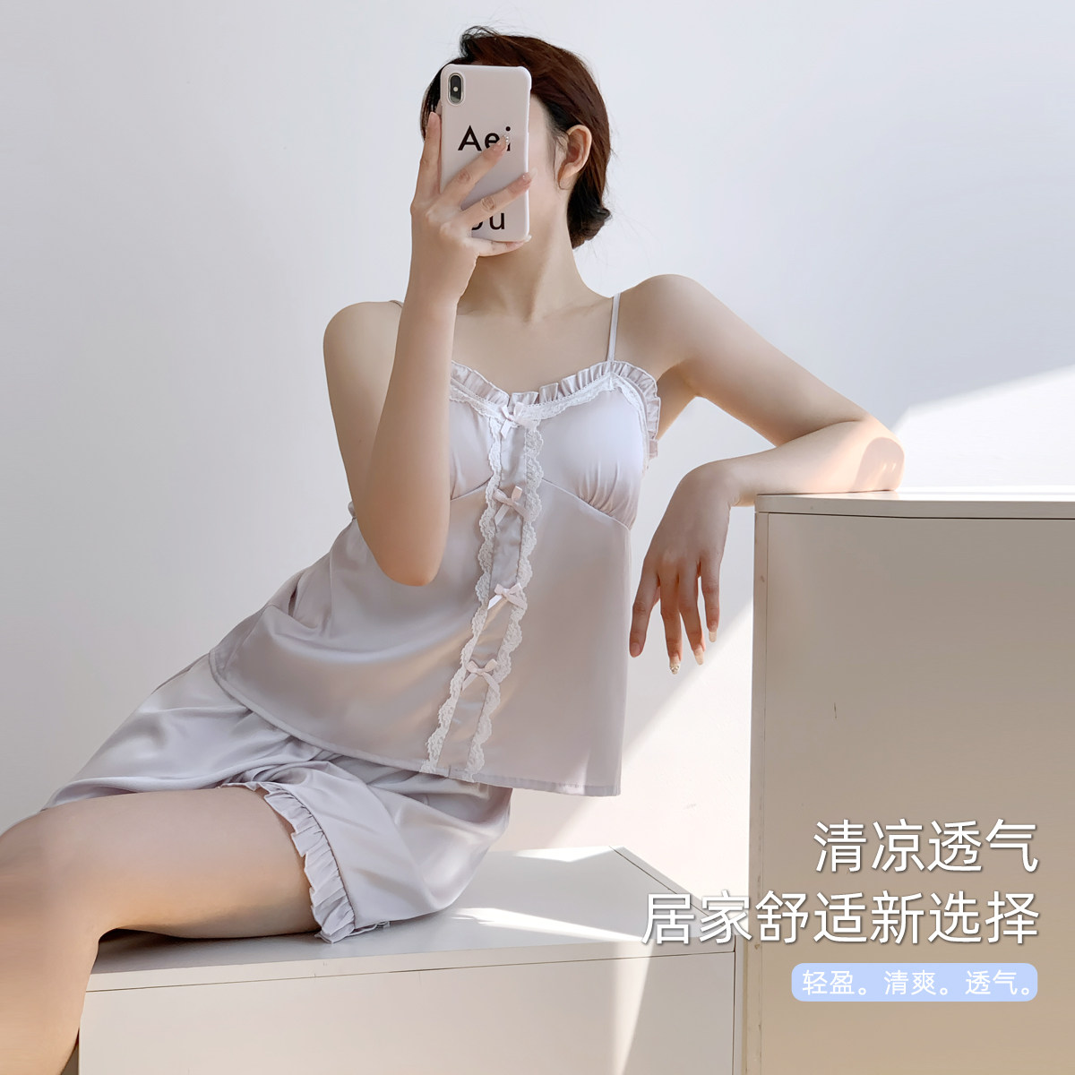 冰丝性感吊带短裤睡衣女士带胸垫纯欲风夏季紫色蕾丝水光丝家居服