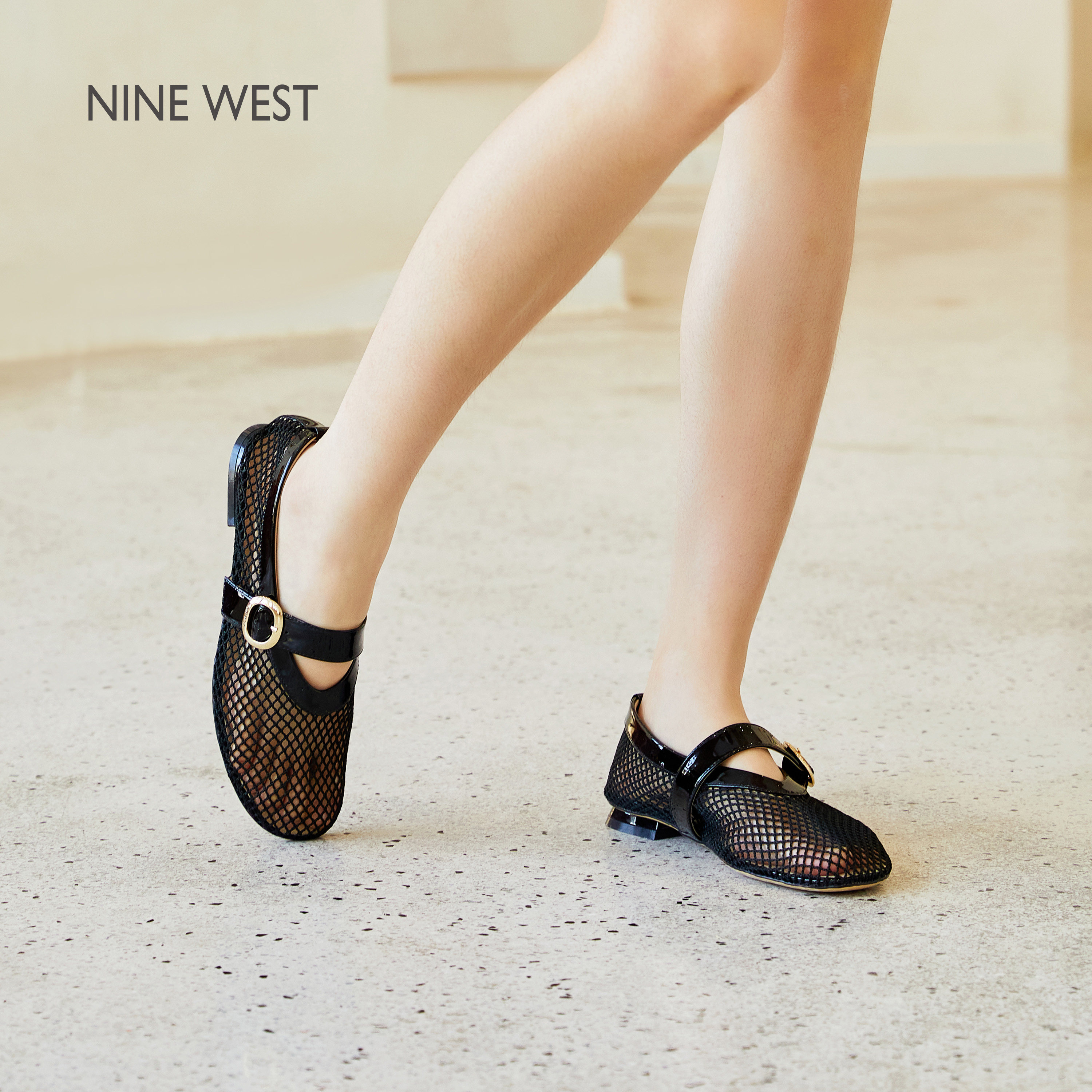 Nine West/玖熙镂空一字带凉鞋女士平底软底懒人鞋外穿渔网鞋黑色