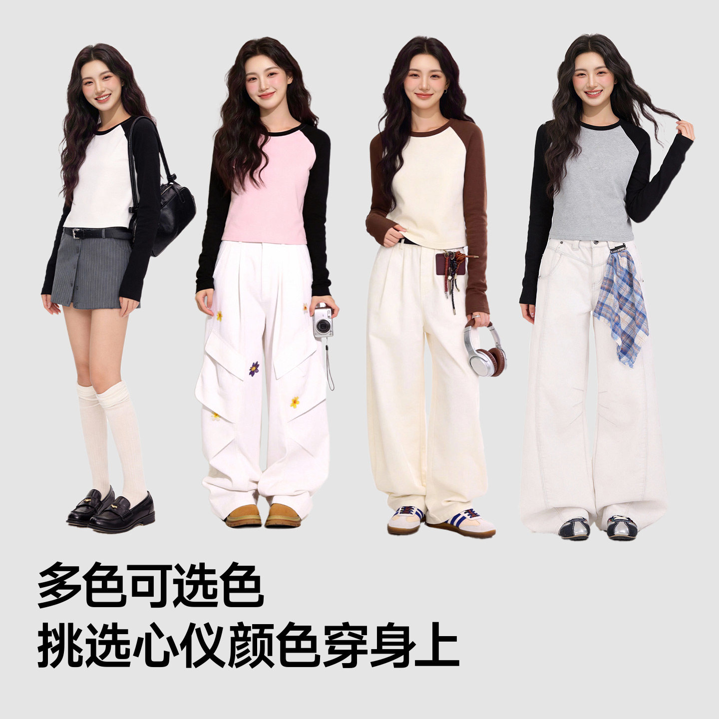 猫人2026春季新款撞色插肩袖休闲长袖体恤衫圆领基础打底T恤短款Z