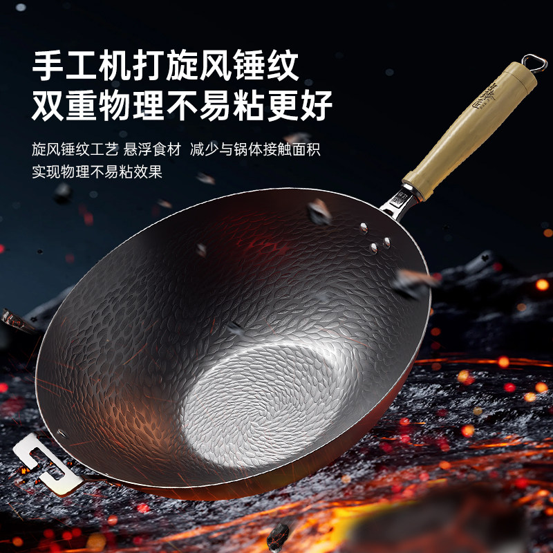 古臻匠锤纹铁锅炒锅无涂层平底圆底氮化不易粘锅不易锈炒菜家用