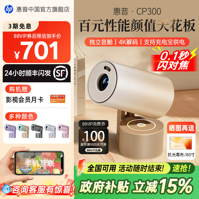 【全国政府补贴立减15%】HP惠普CP300投影仪家用超高清家庭卧室无幕布可连手机投屏器小型投影机学生宿舍投屏