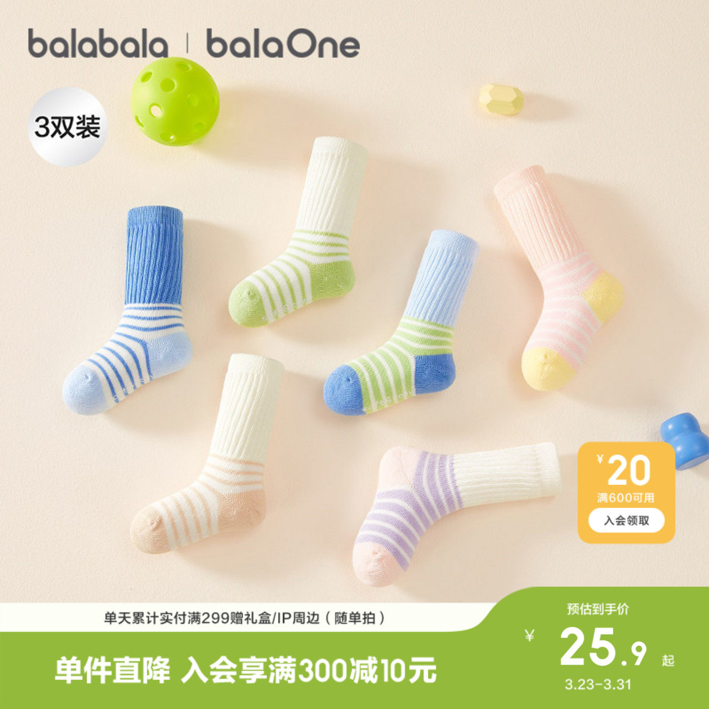 【balaOne】巴拉巴拉儿童袜子春秋男女童棉袜条纹中筒袜萌三双装