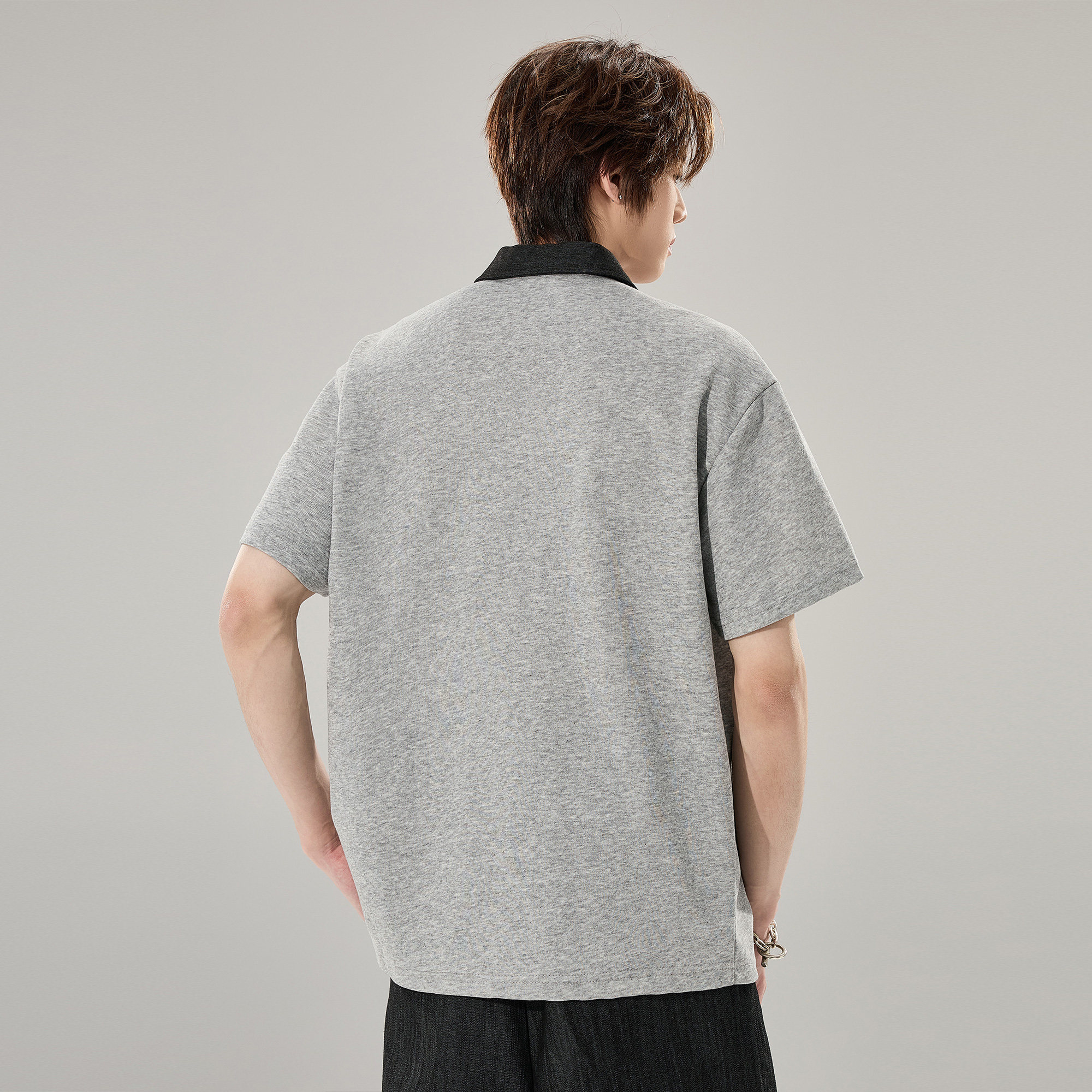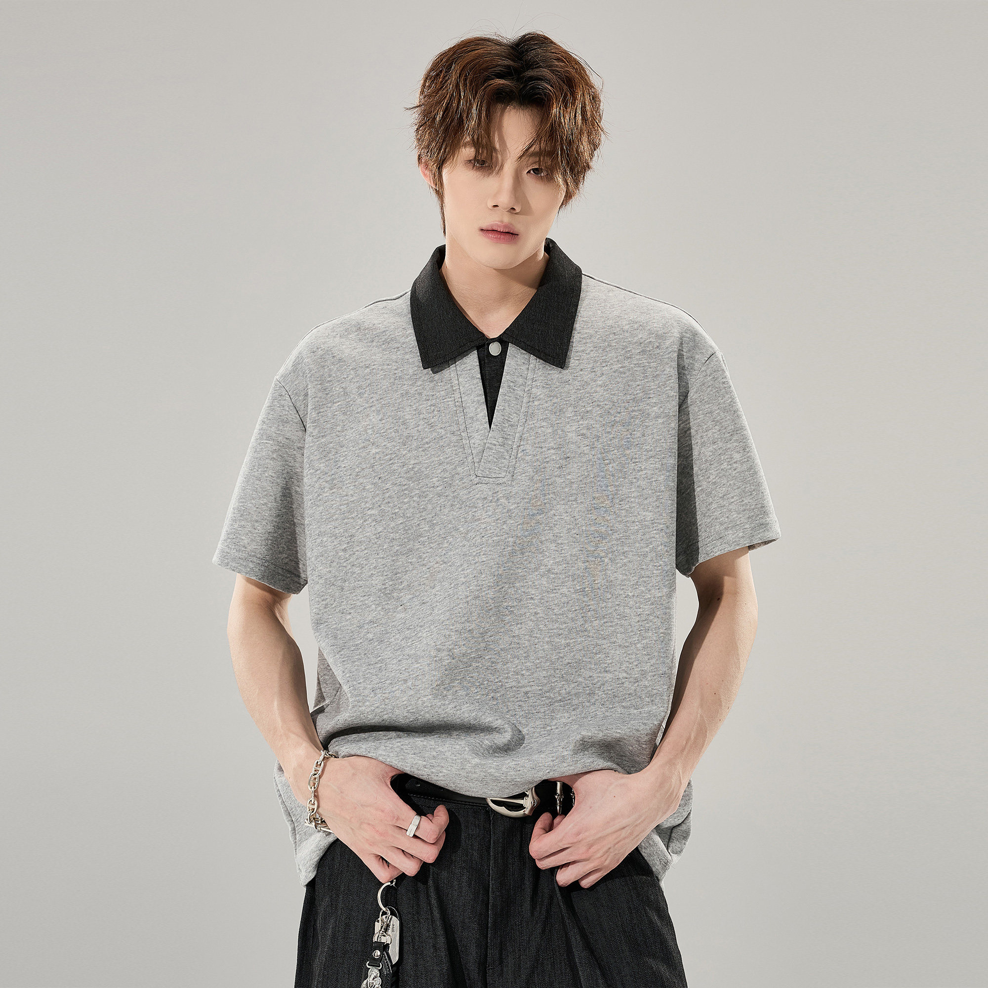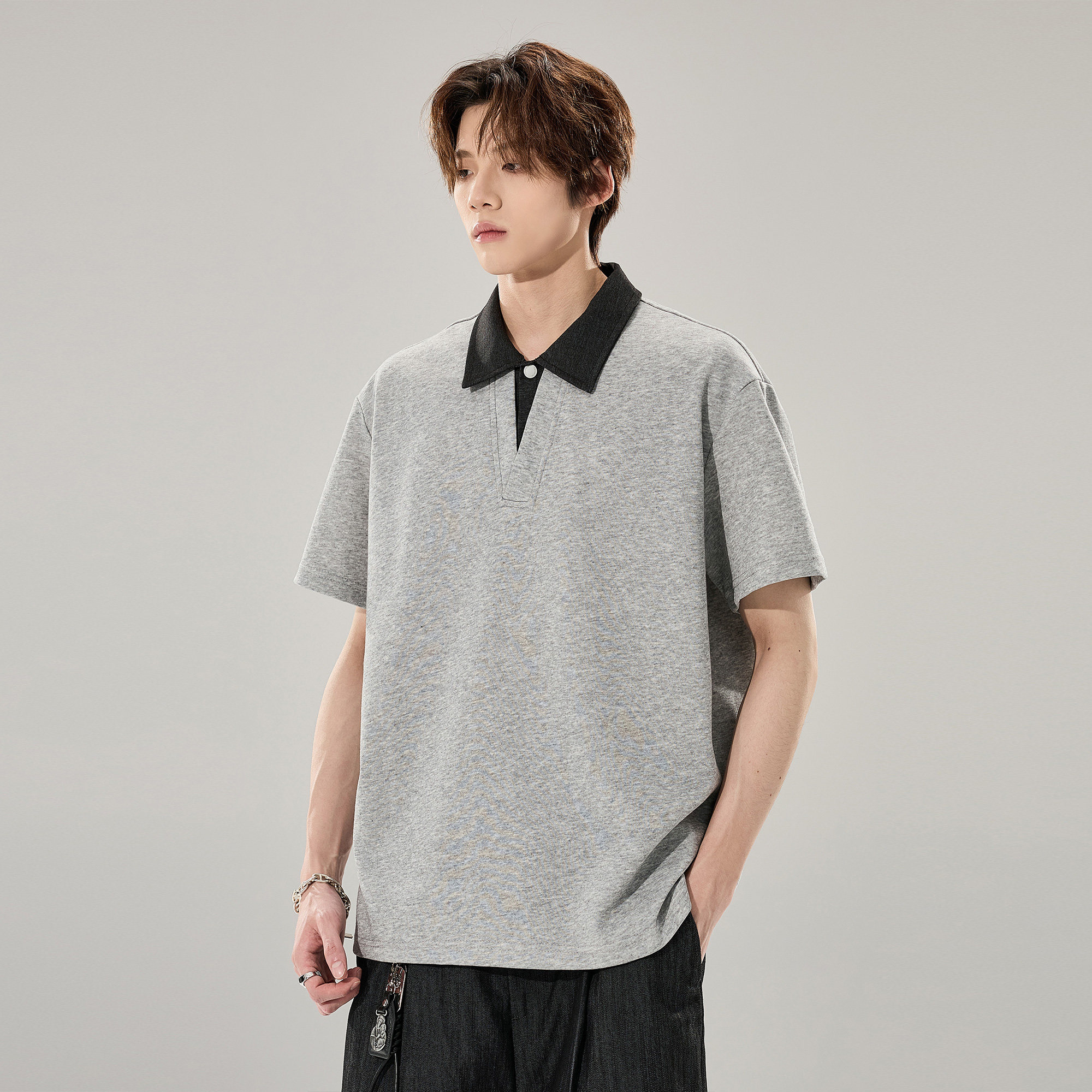 ALLIN 假两件衬衫领拼接短袖T恤男生夏季潮牌重磅情侣Polo衫上衣