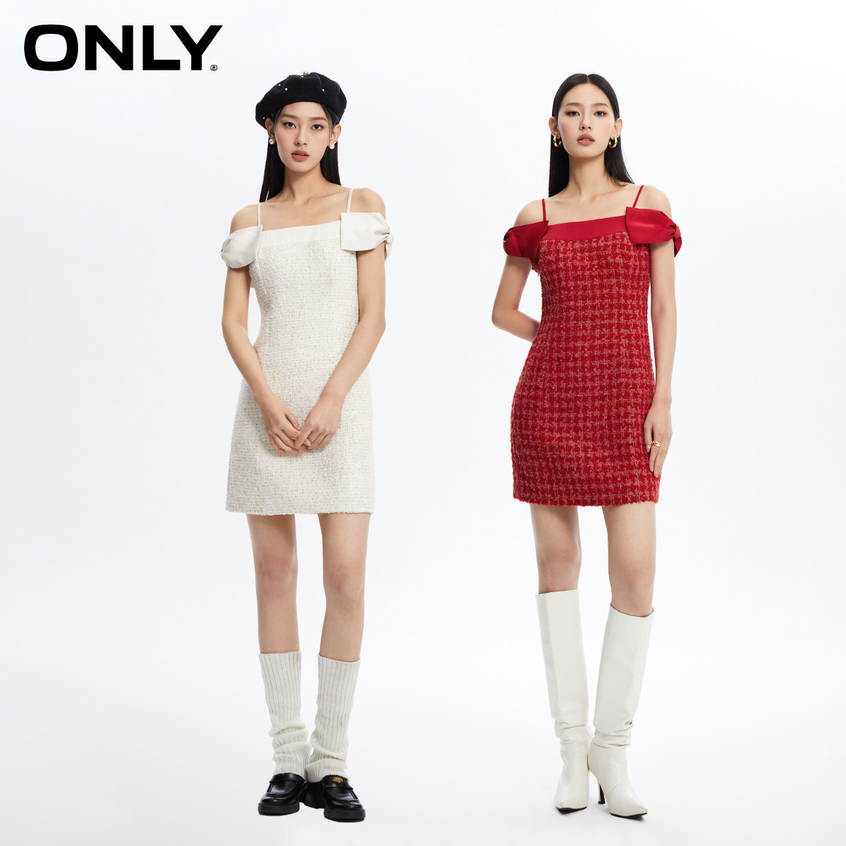 拼接面料 蝴蝶结装饰 粗花呢裙身