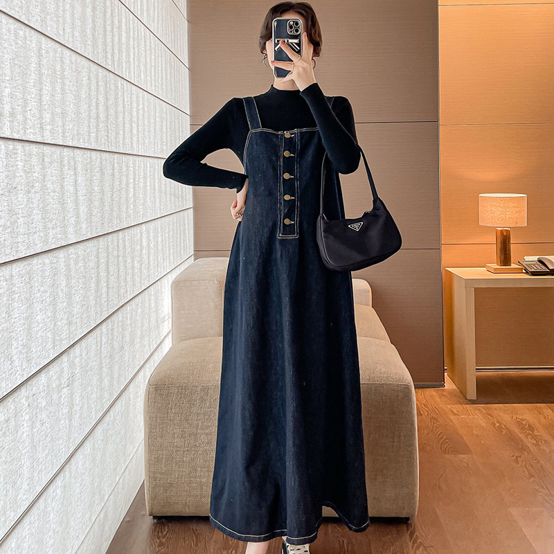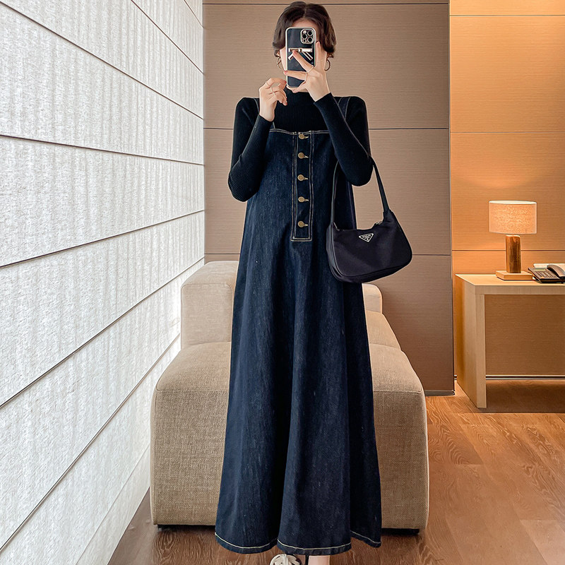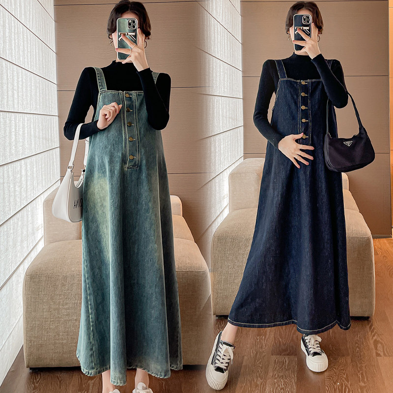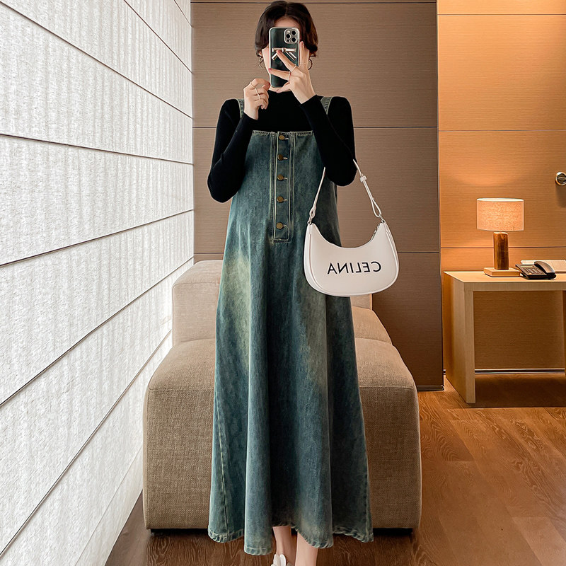 孕妇春装牛仔背带裙春秋季款2025新款套装两件套大码连衣裙秋装女