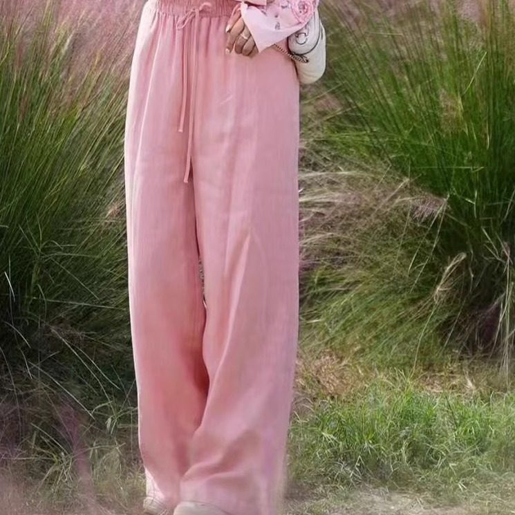 双侧带口袋棉绸绵绸人造棉高腰显瘦直筒裤女宽松休闲百搭阔腿长裤
