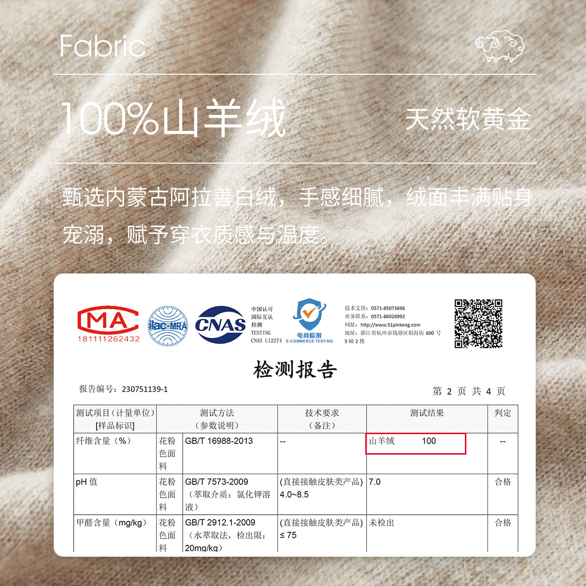 100%拉绒山羊绒+绵羊毛无缝一体亲肤柔软针织拉绒圆V领宽松打底衫