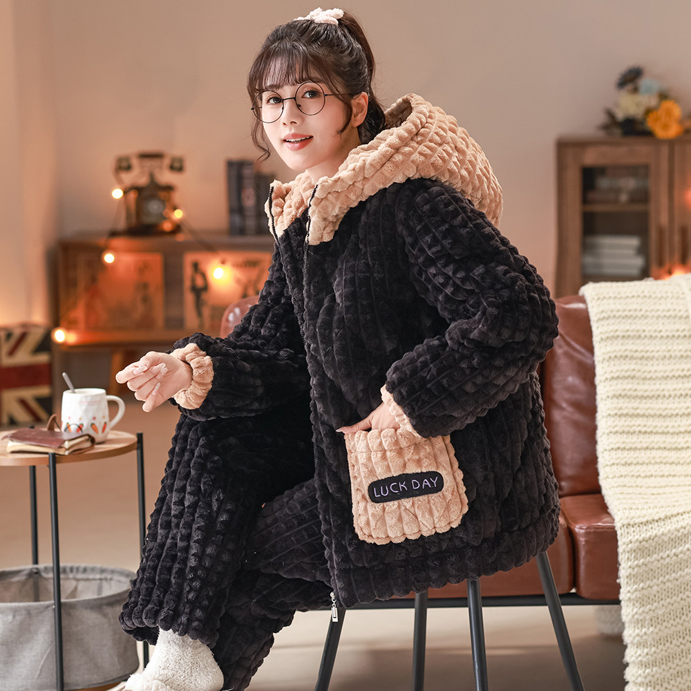 冬季新款三层加厚夹棉睡衣女保暖家居服套装情侣连帽特厚夹棉外套