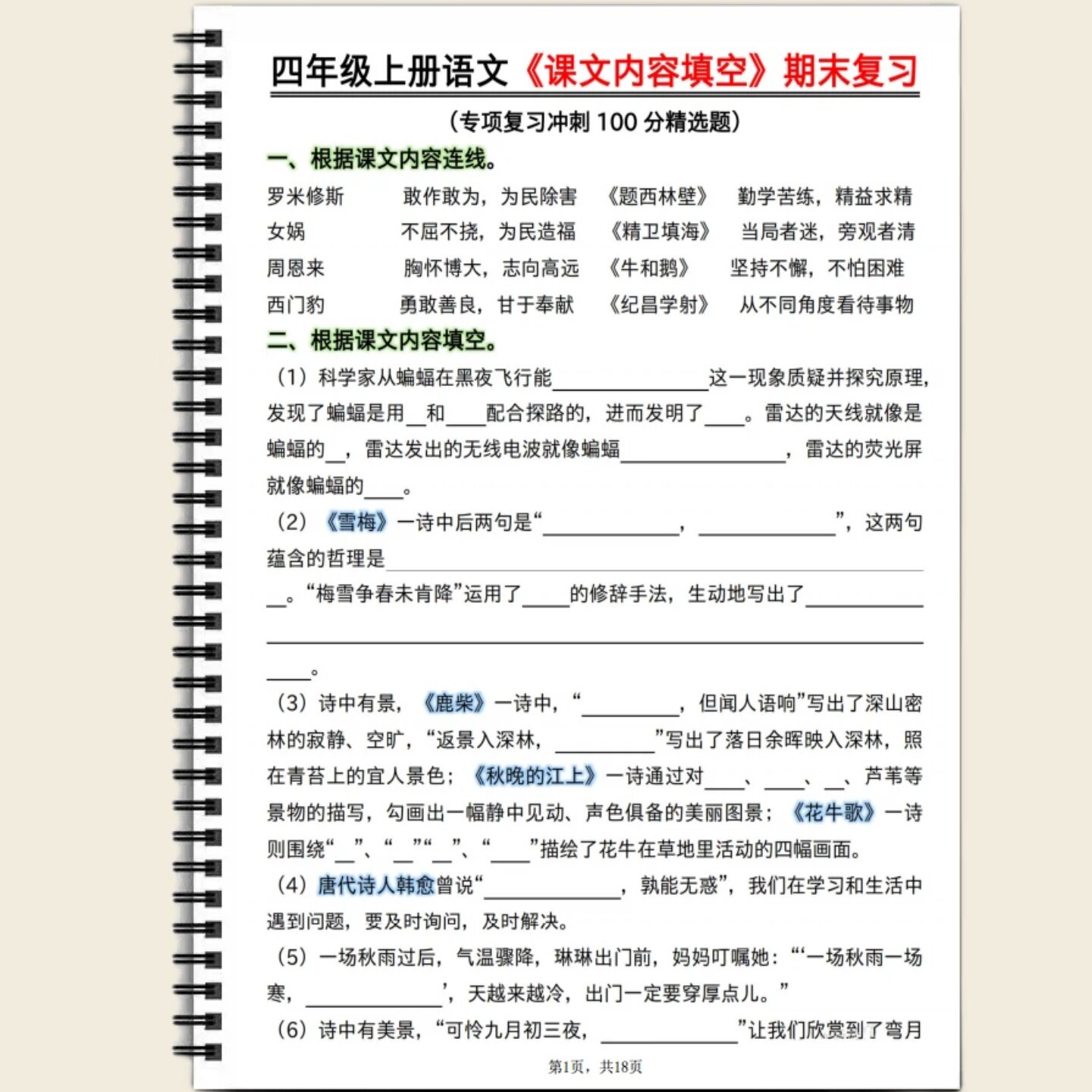 人教版四年级上下册语文按课文内容填空及相关拓展含答案期中期末常考形式