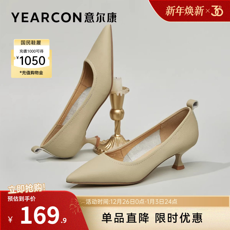 意尔康女鞋春秋季中跟女士皮鞋真皮尖头通勤气质细跟配裙子单鞋