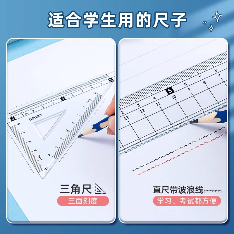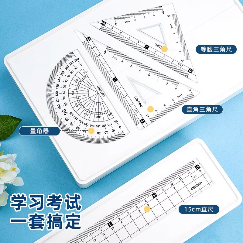 得力文具学生套尺透明亚克力尺子绘图四件套三角尺直尺量角器套装