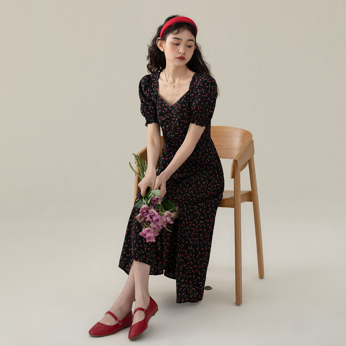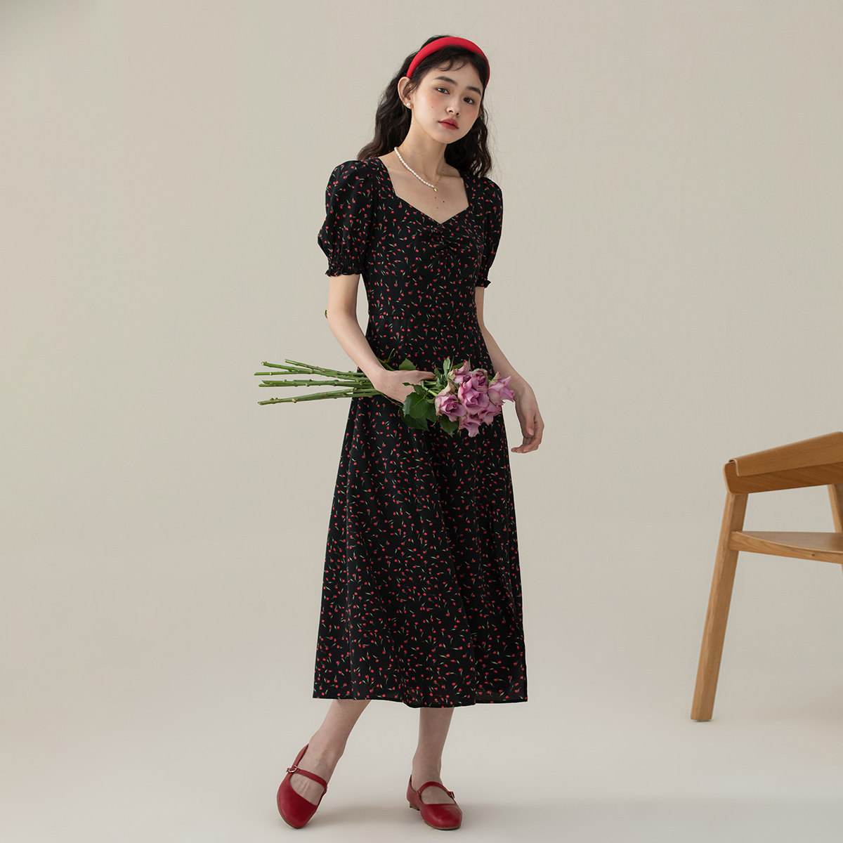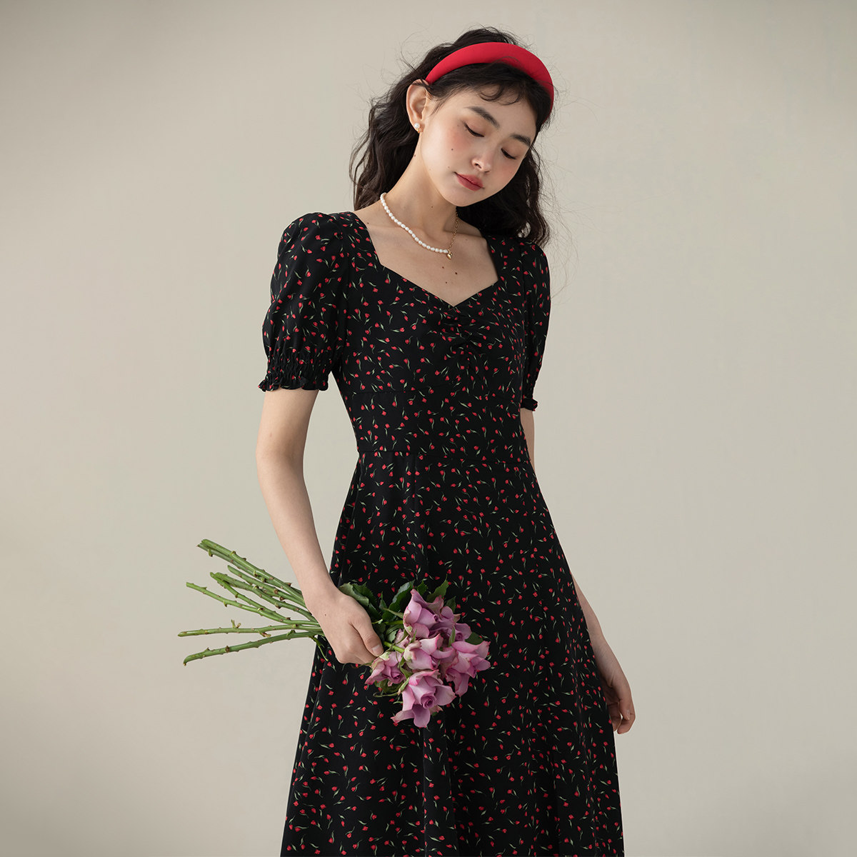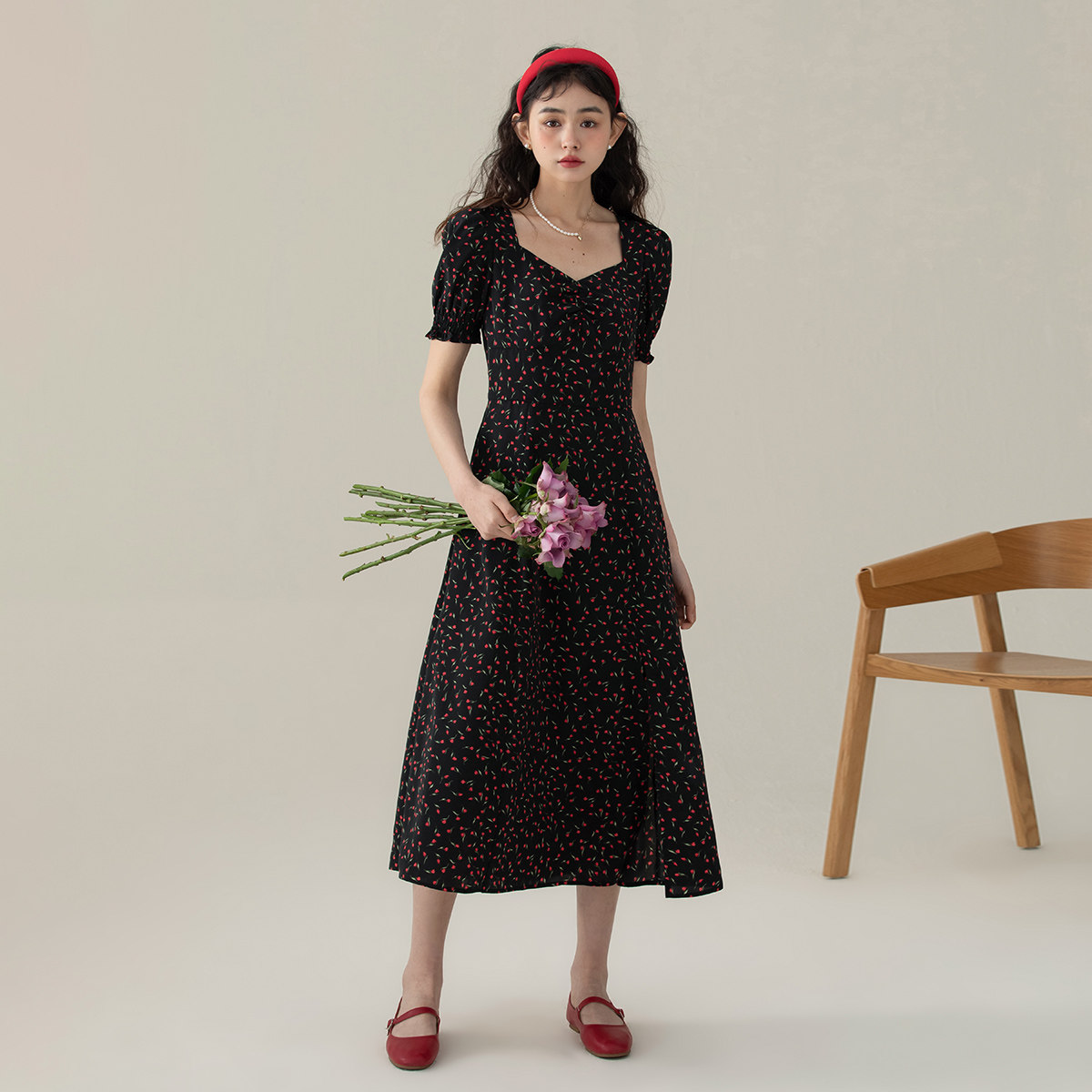 one more法式方领碎花裙修身连衣裙女气质高级感短袖茶歇裙长裙