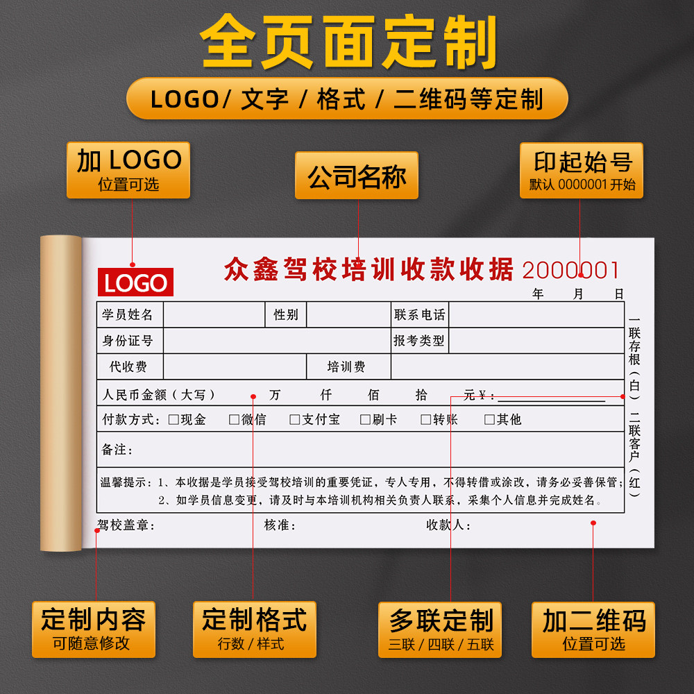 【驾校培训专用收据】收款收剧驾照定金单据学员学车报名收费票据