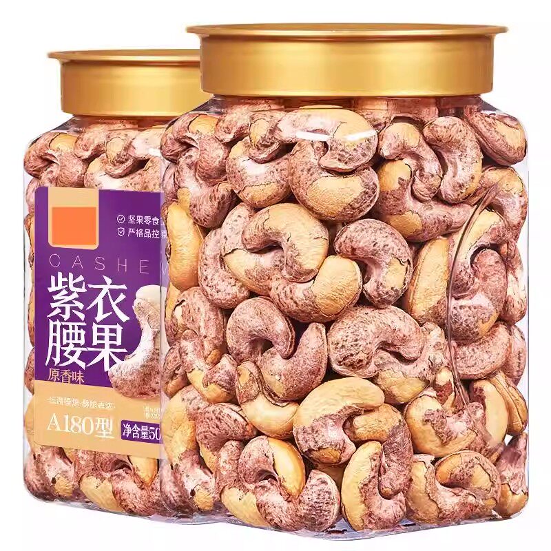 2025年新货带皮腰果500g原味盐焗大颗粒罐装紫衣紫皮干果坚果零食