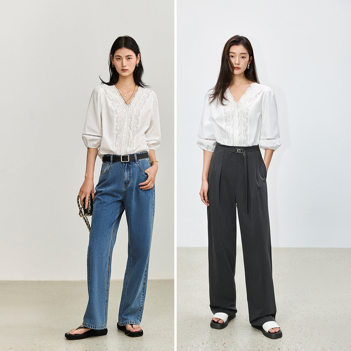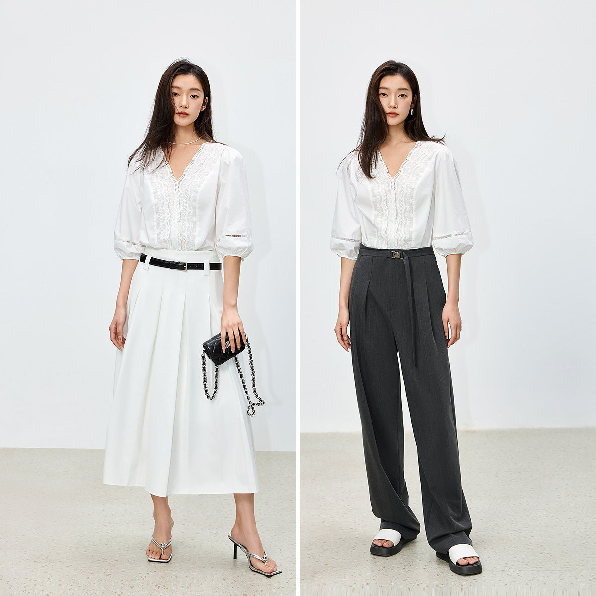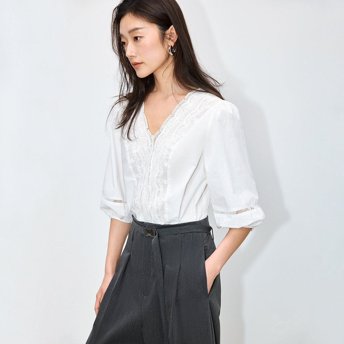 LILY2026夏新款法式气质重工花边V领全棉白色泡泡袖通勤雪纺衫女