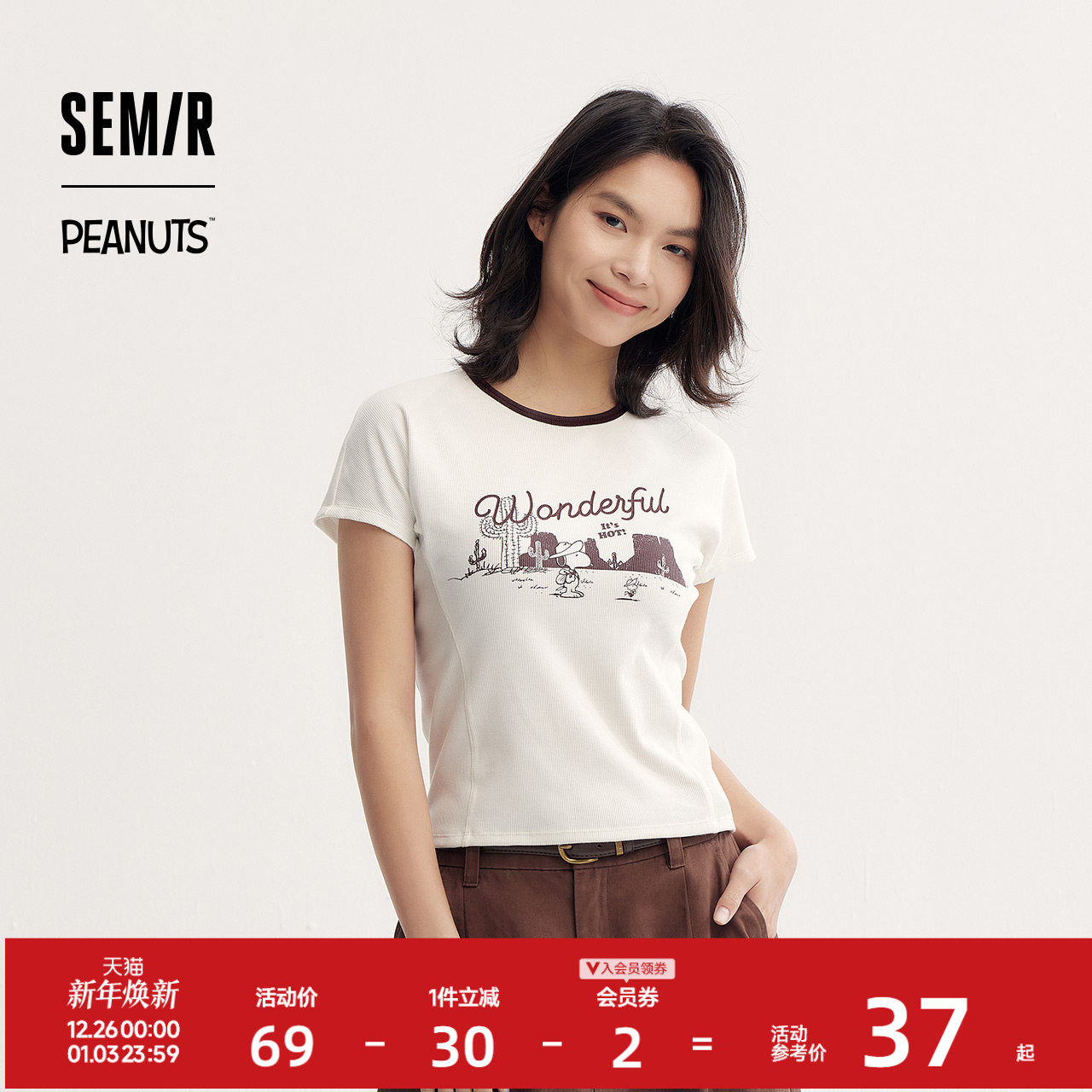 森马史努比系列短袖T恤女短款紧身撞色复古风夏季小个子印花上衣