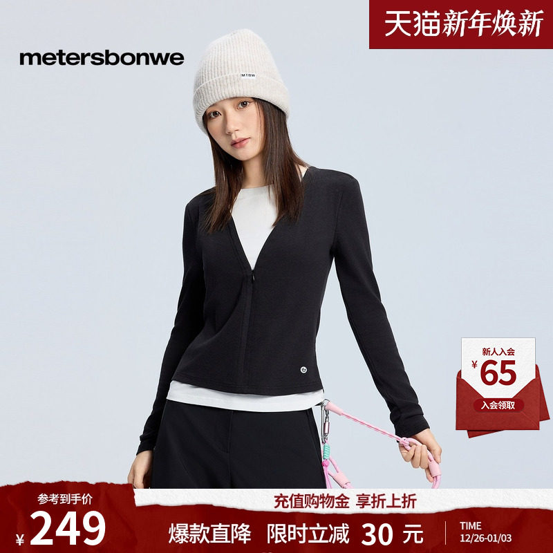 美特斯邦威T恤女2025冬季新款时尚潮流超暖v领假两件保暖长袖体恤