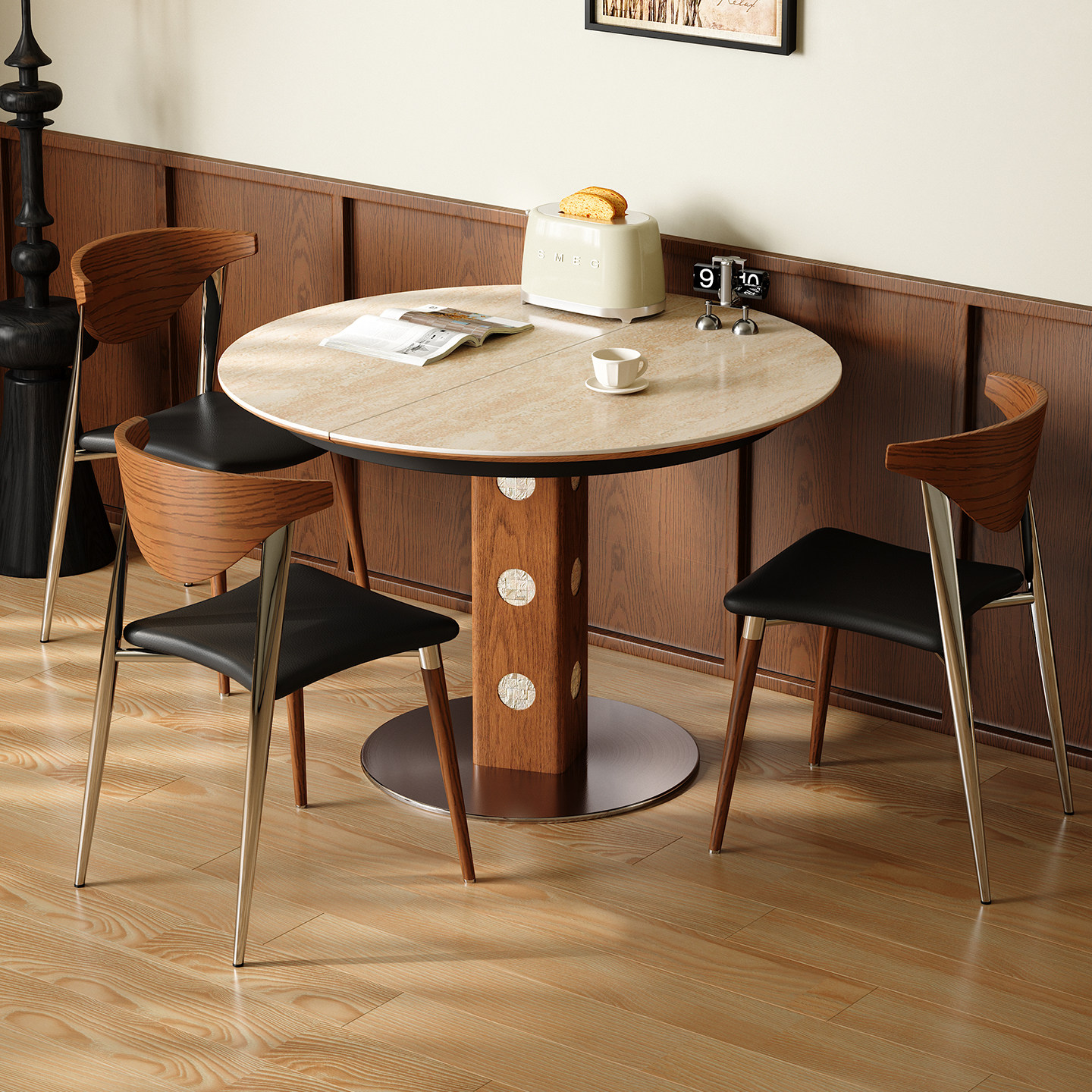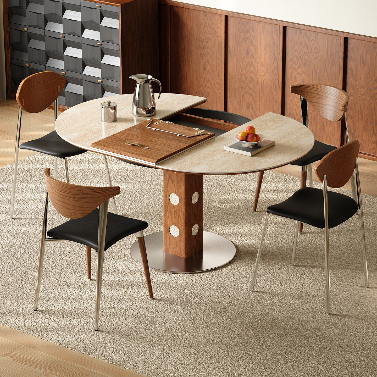 木小咖实木胡桃色洞石岩板餐桌折叠伸缩方圆两用伯格圆饭桌椅组合
