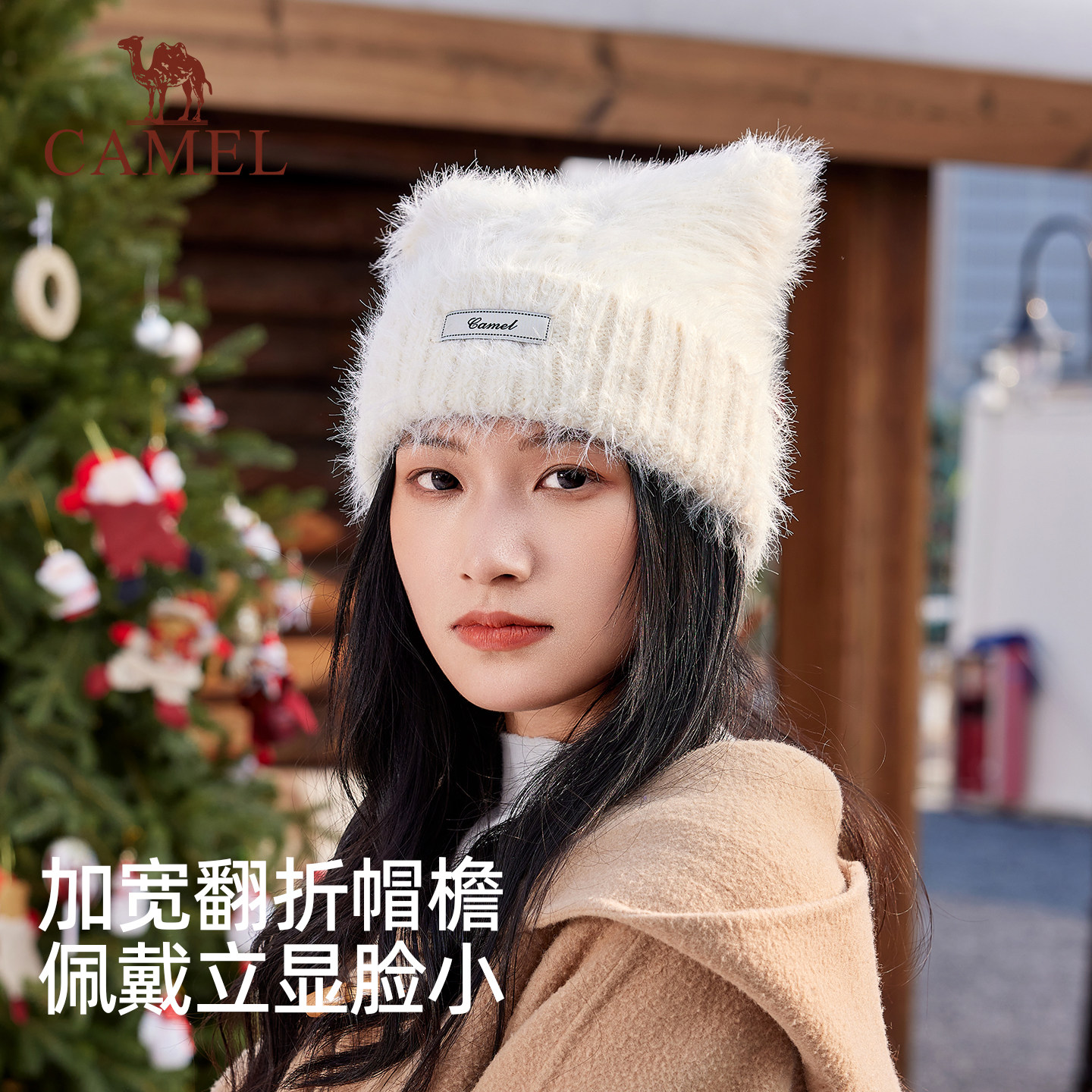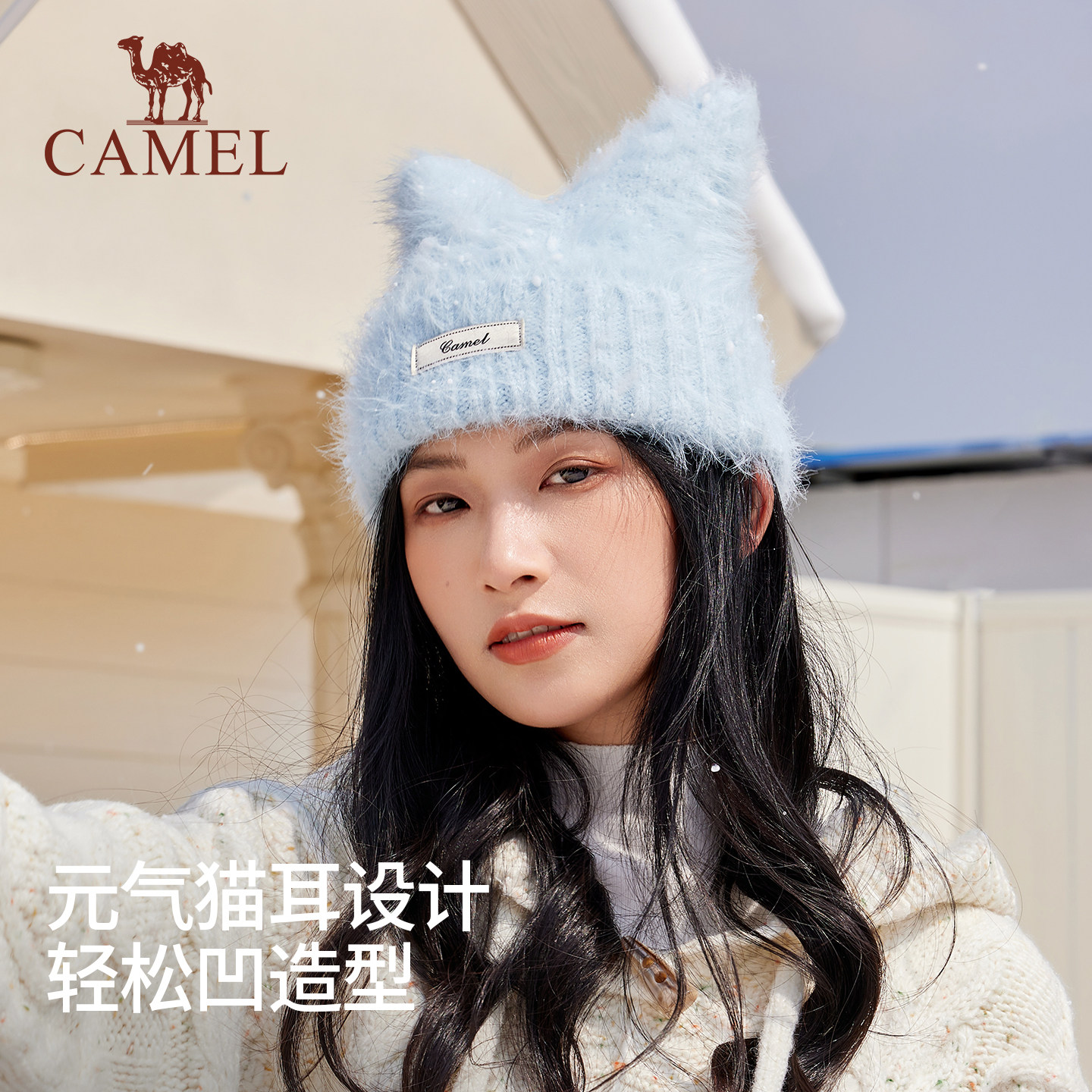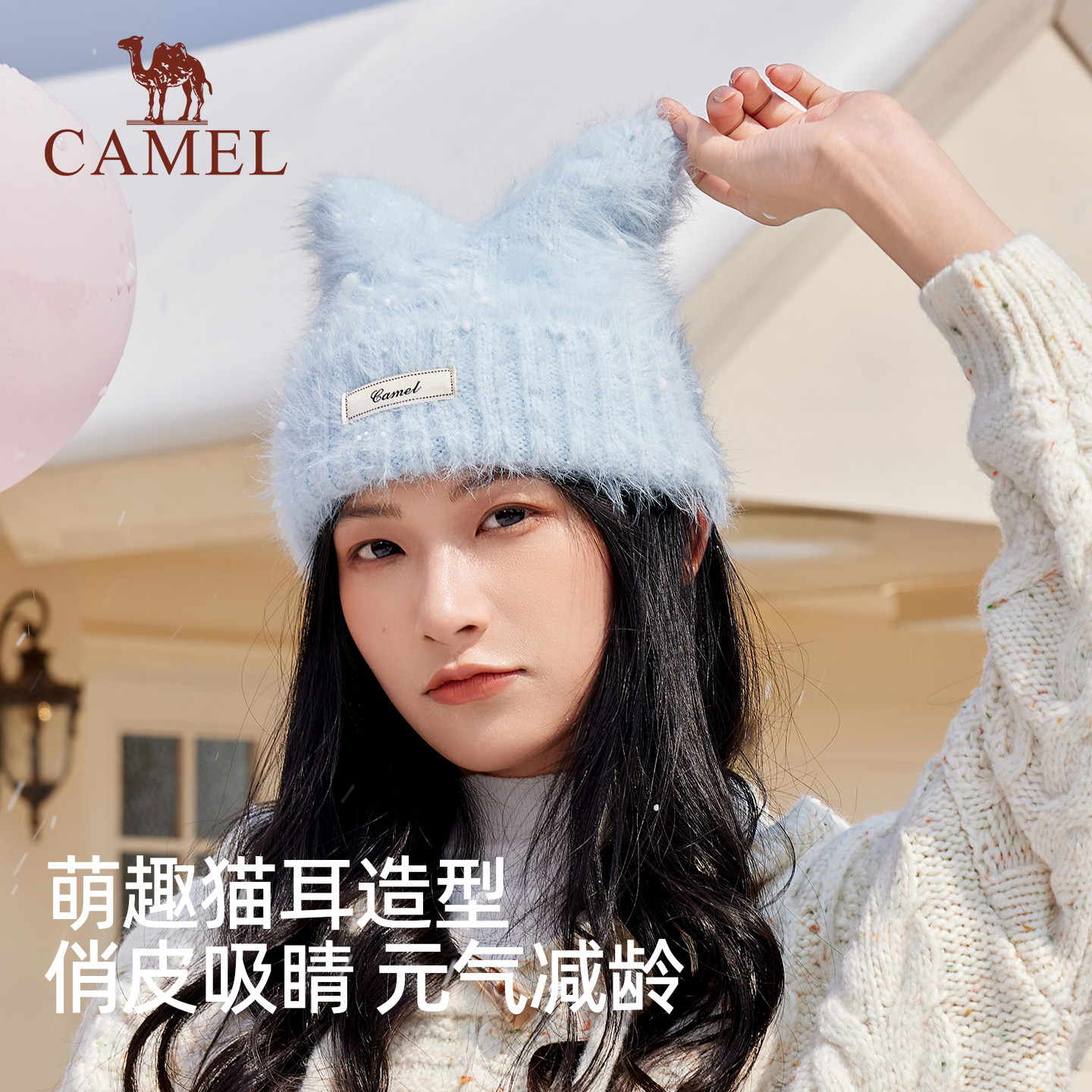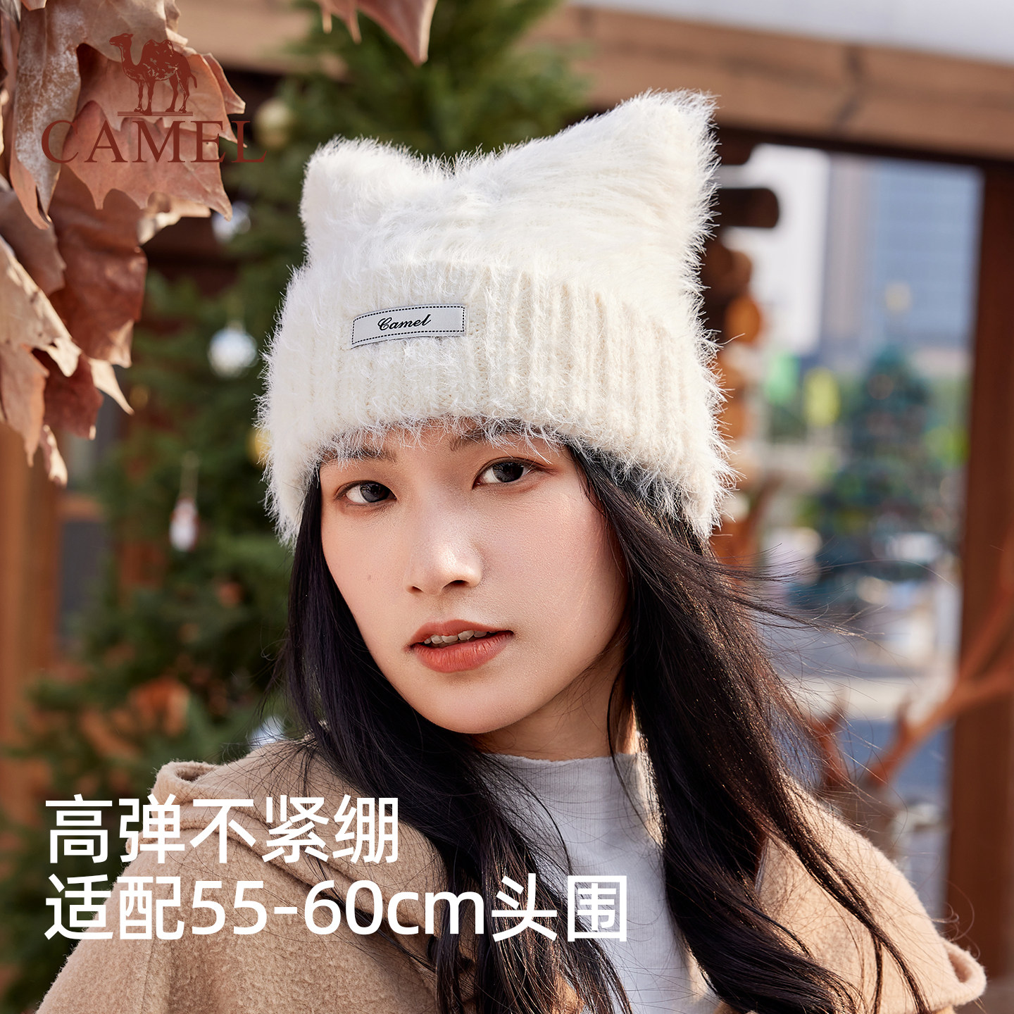 骆驼猫耳针织帽2025年新款秋冬季女可爱毛绒纯色冷帽保暖毛线帽子
