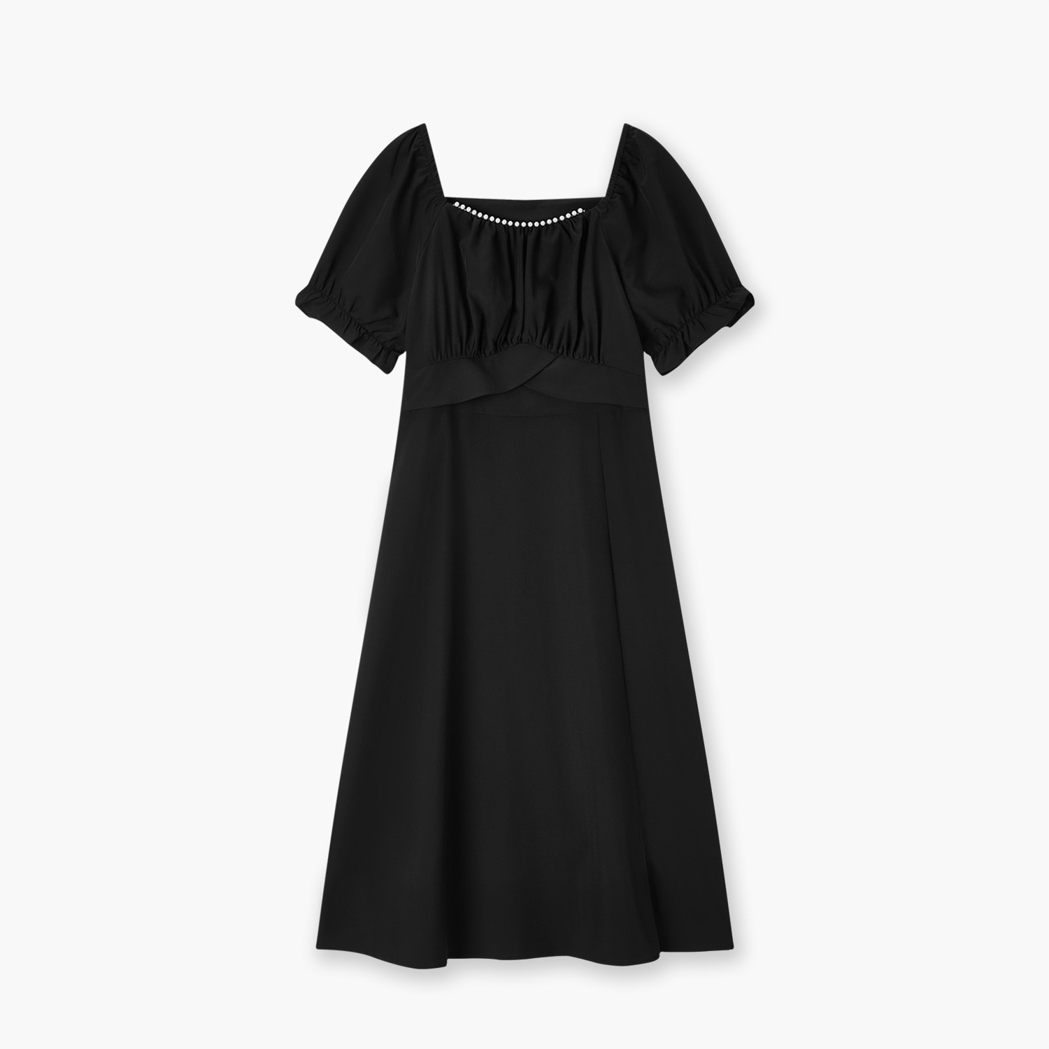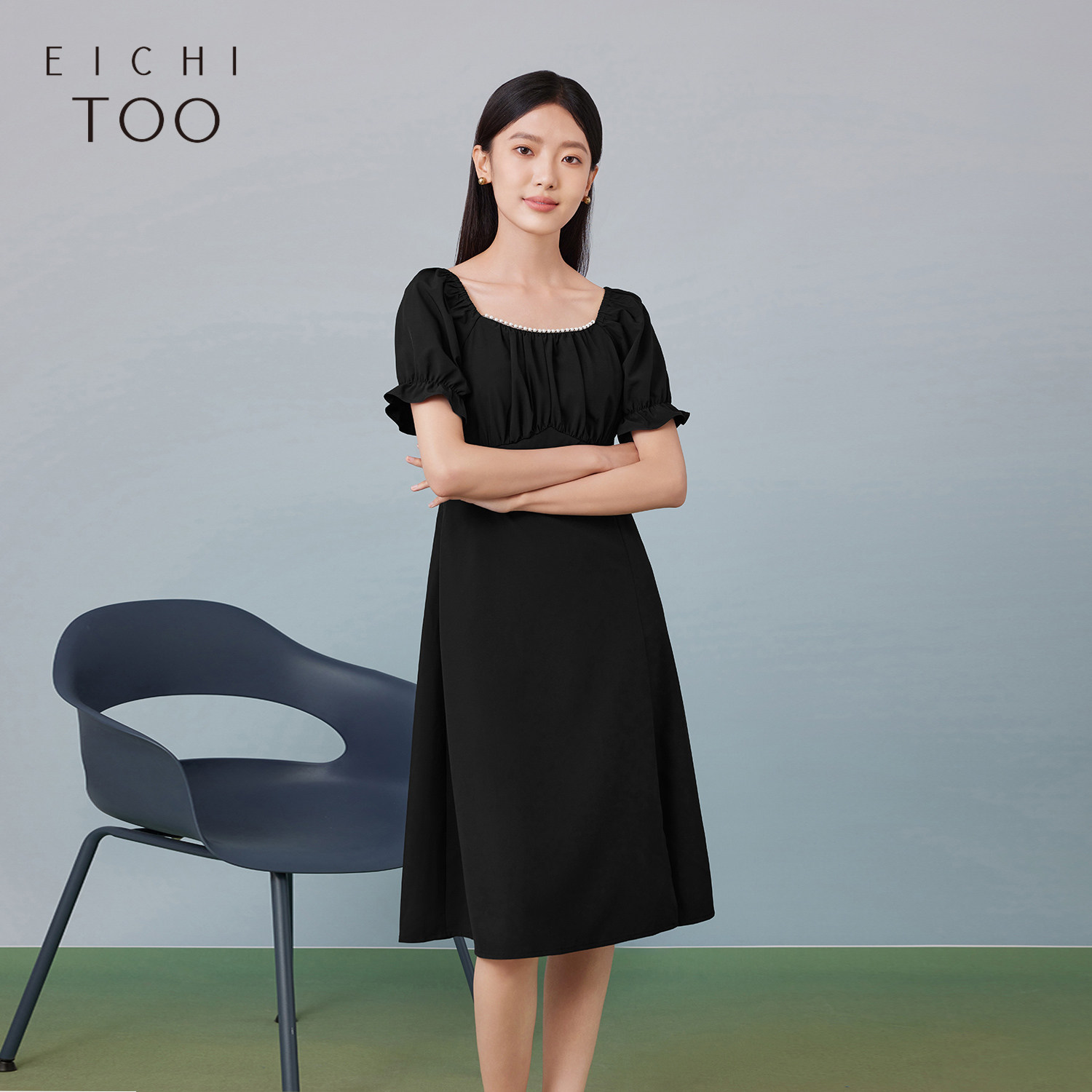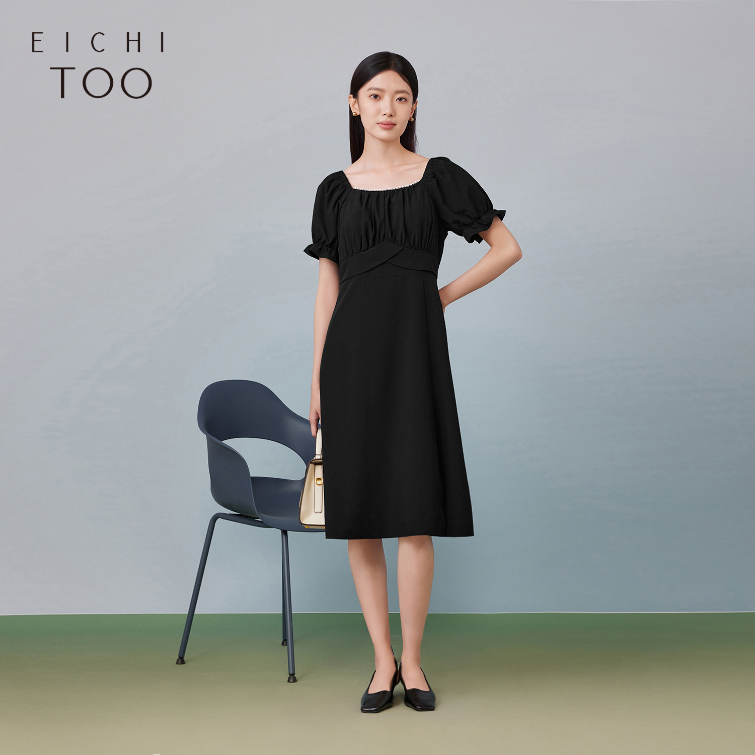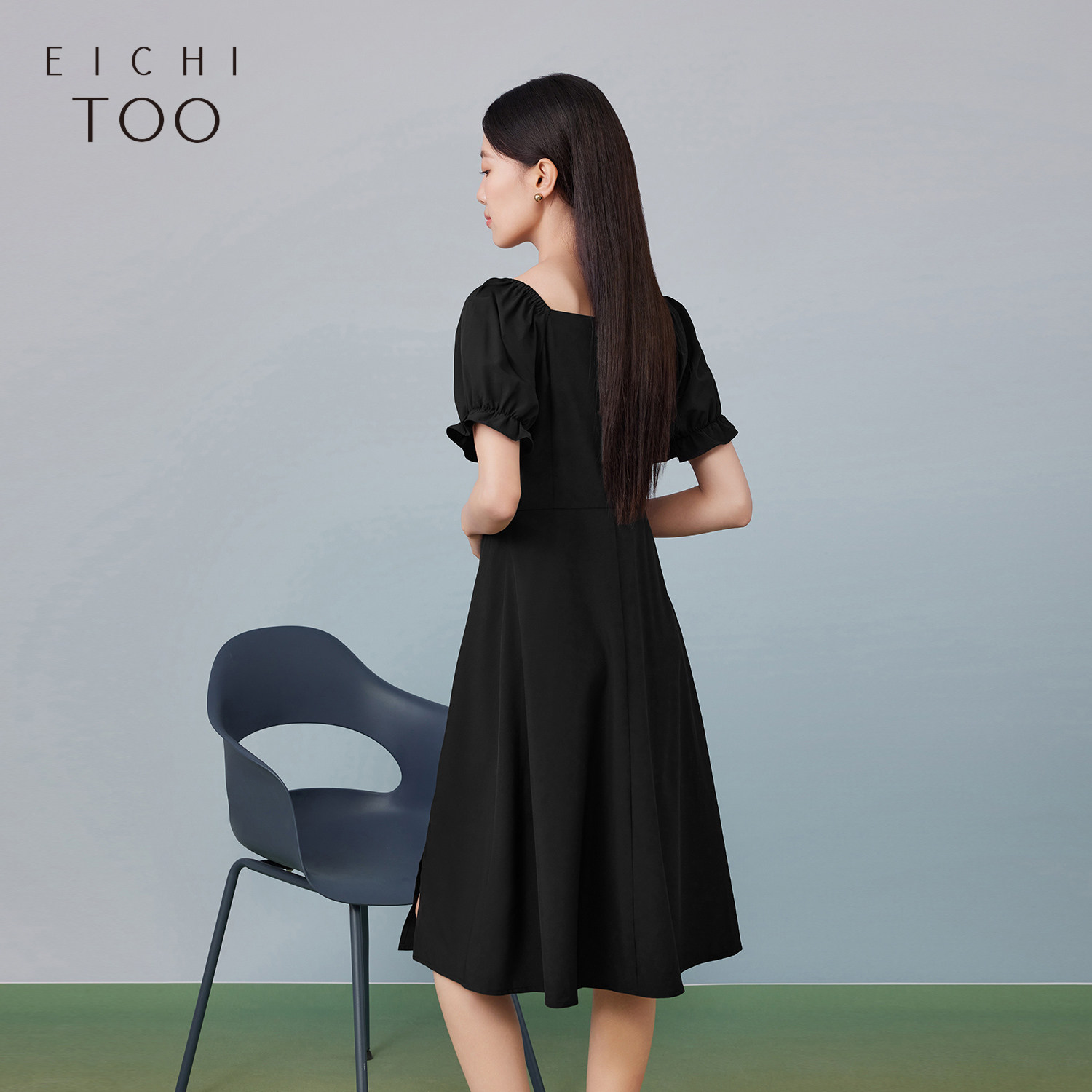爱居兔夏季新款优雅方领赫本风小黑裙短袖连衣裙