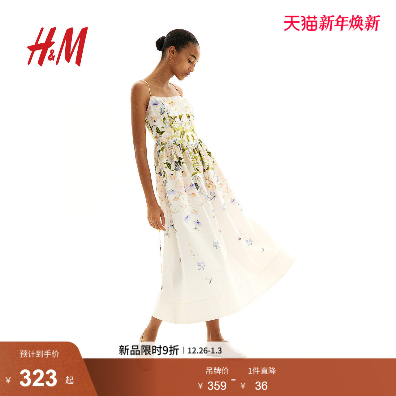 HM女装连衣裙25冬新款法式方领无袖度假植物印花吊带长裙1268173