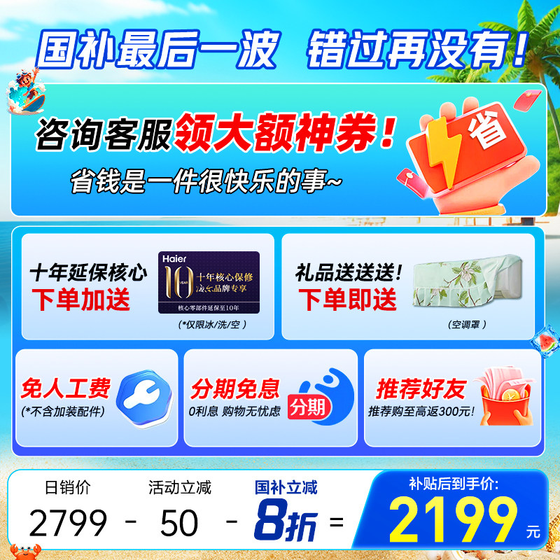 [国补20%]海尔空调1.5匹家用一级能效变频冷暖卧室统帅挂机节能