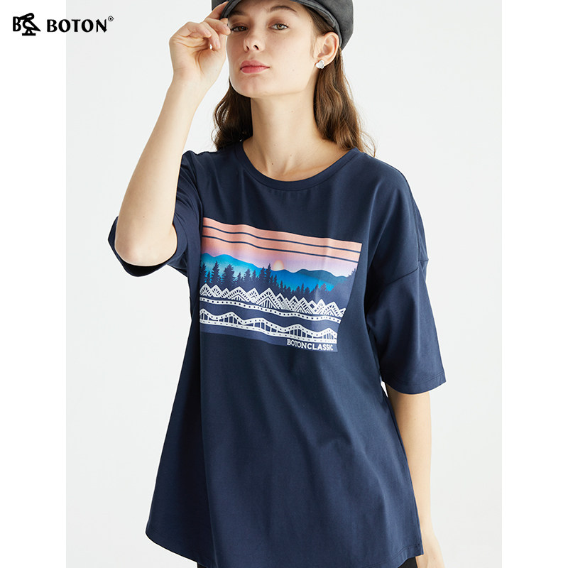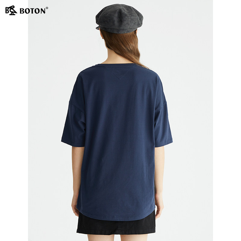 波顿夏季新款宝蓝色短袖t恤女印花宽松显瘦圆领纯色上衣
