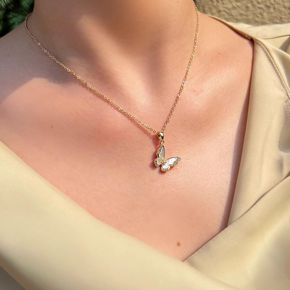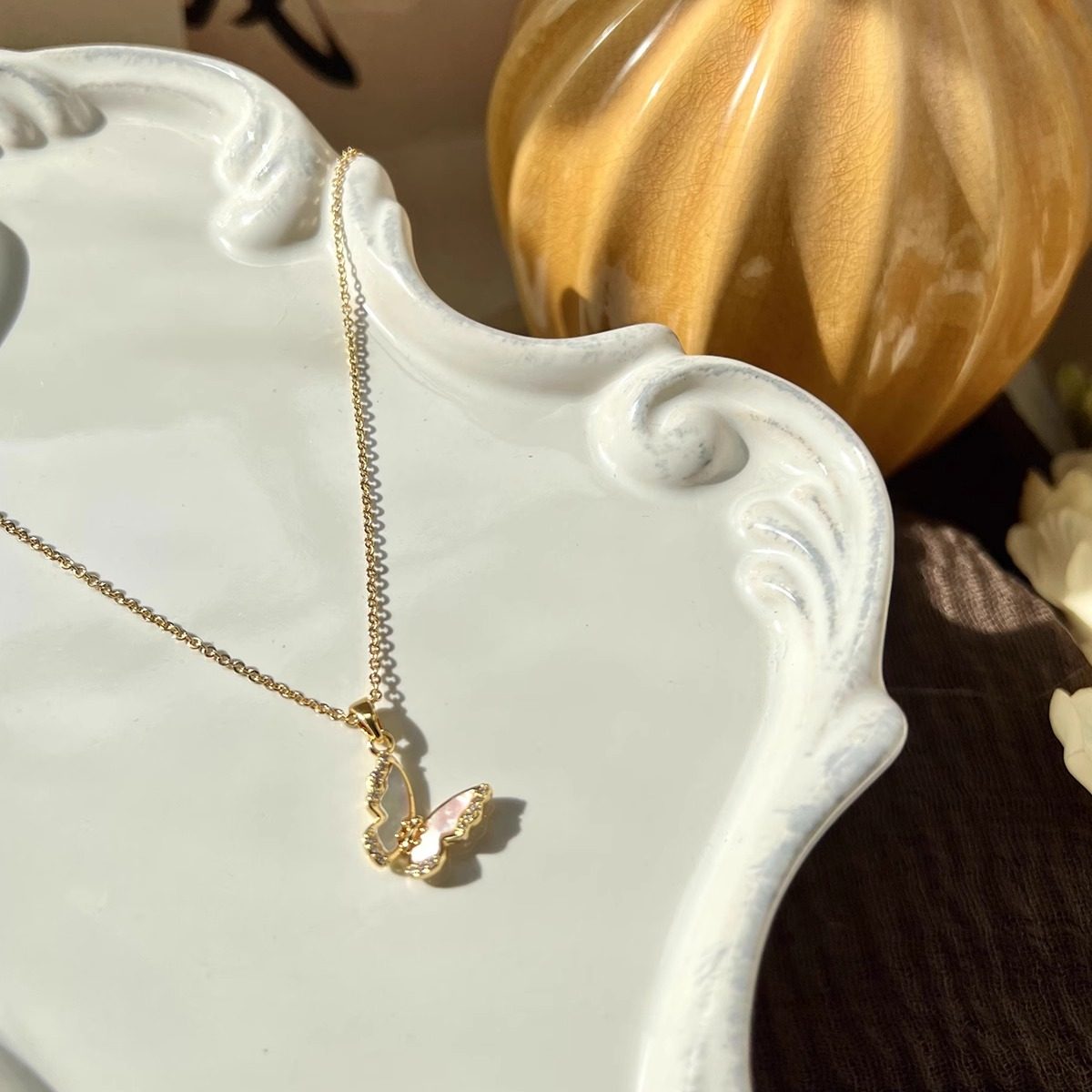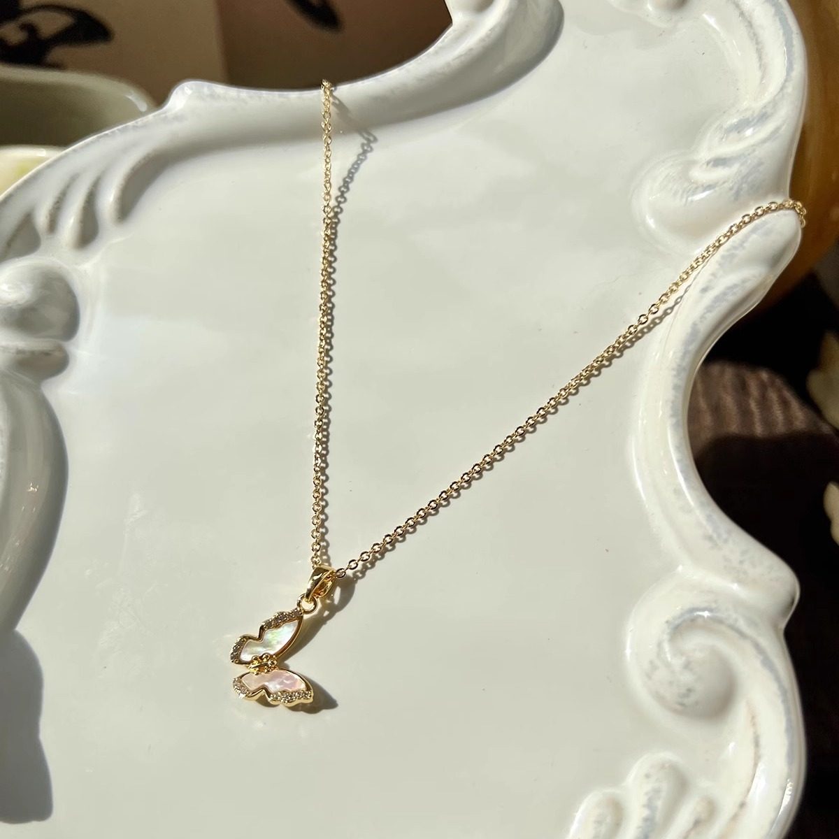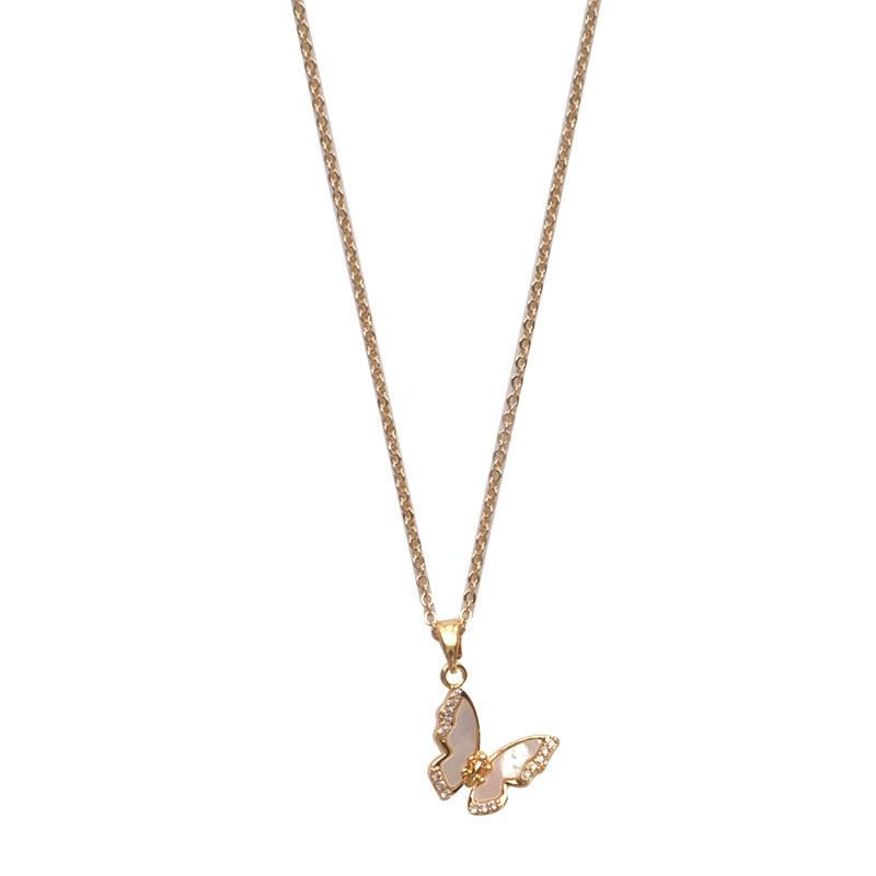 知更鸟|白玉蝶 法式精致复古轻奢天然贝壳镶钻蝴蝶项链锁骨链女
