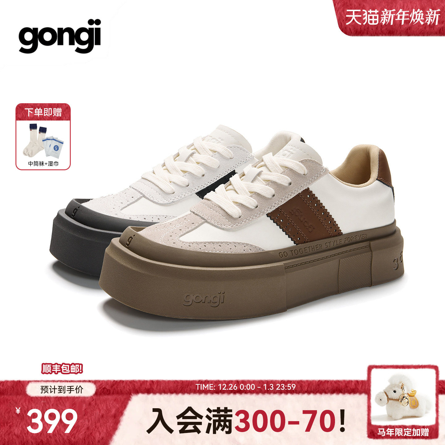 【董璇同款】GONGJI厚底德训鞋女方头增高鞋子秋冬百搭小白鞋板鞋