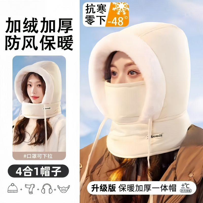 围巾帽子手套一体女连帽冬季帽可爱保暖围脖毛绒冬天三件套厚防寒
