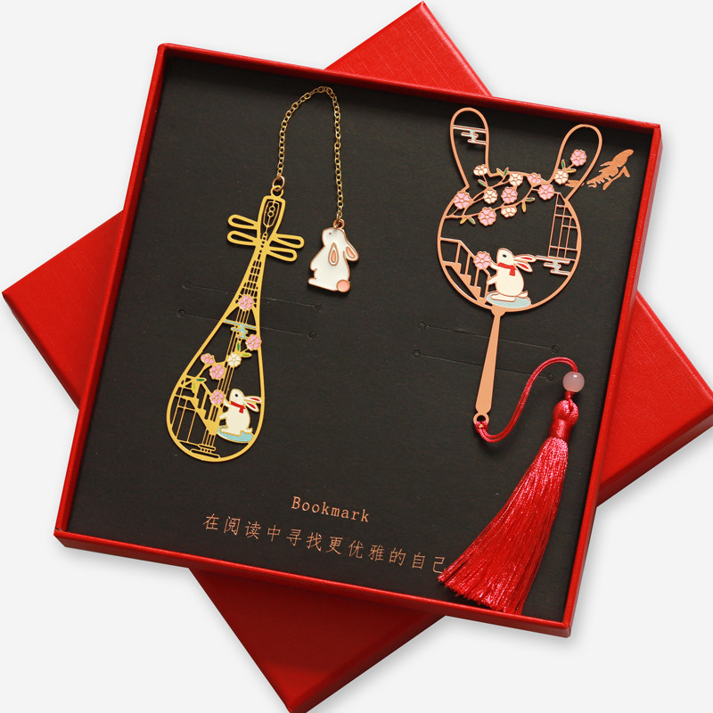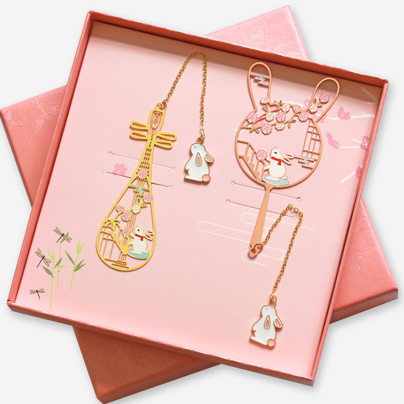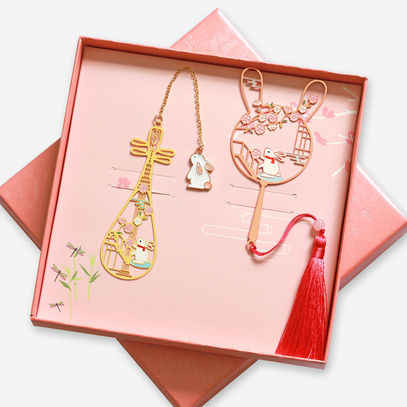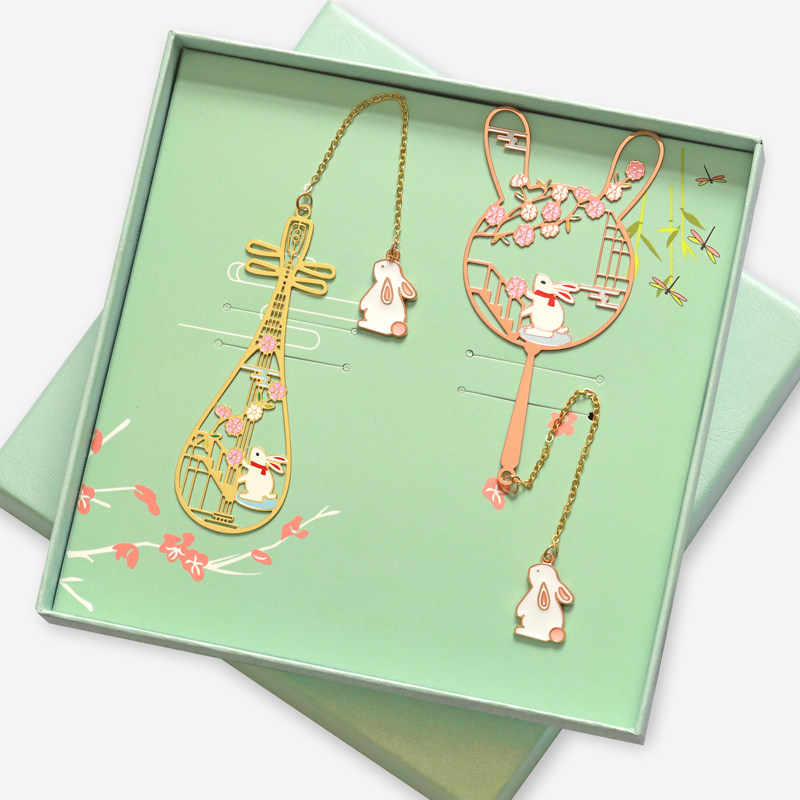 琵琶樱花兔樱花猫团扇黄铜镀金书签金属创意礼品定制刻字礼物猫咪可爱吊坠流苏书签