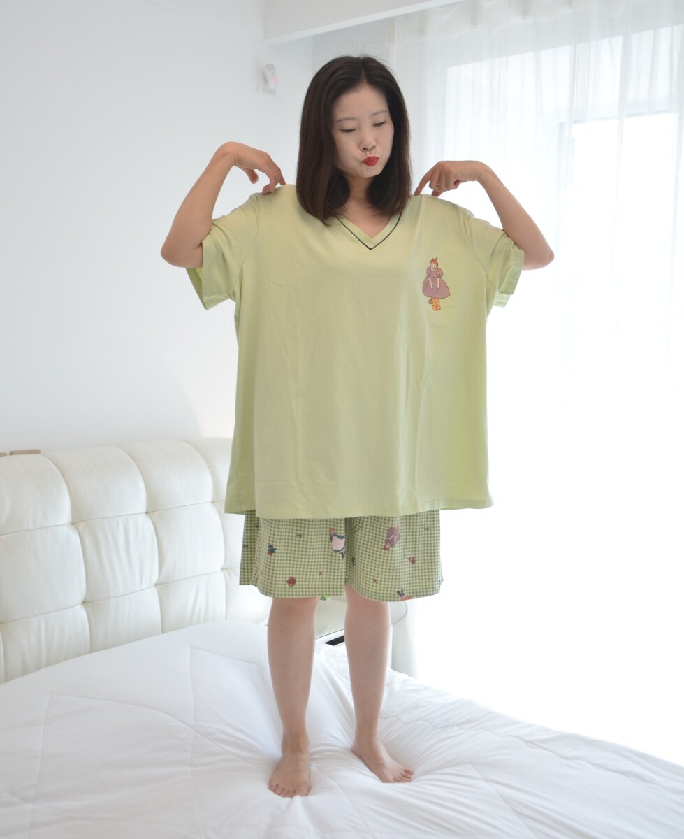 200斤加肥加大码针织纯棉短袖短裤睡衣女胖MM宽松V领家居服套装