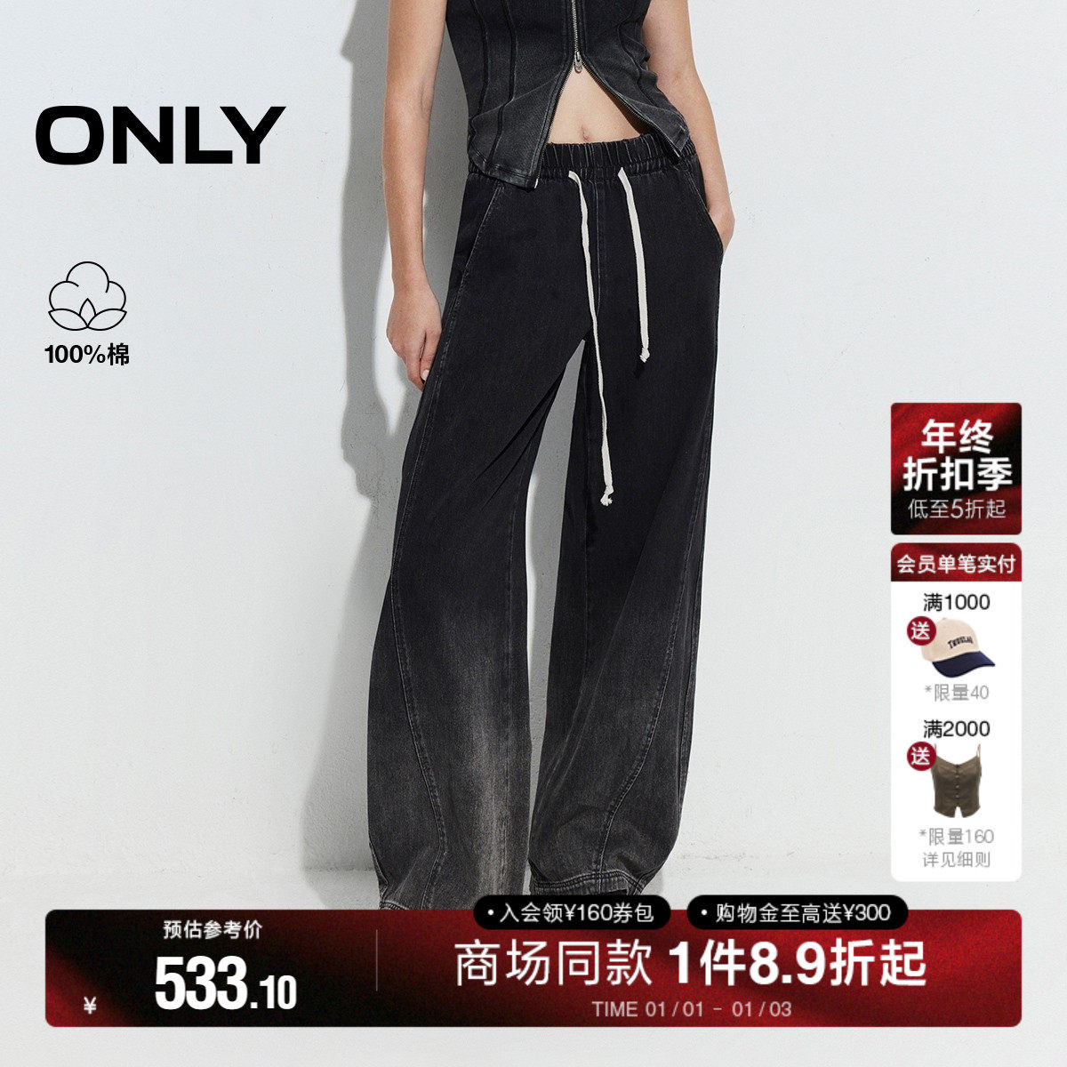 ONLY2026春季新款纯棉渐变水洗立体剪裁设计显瘦抽绳阔腿牛仔裤