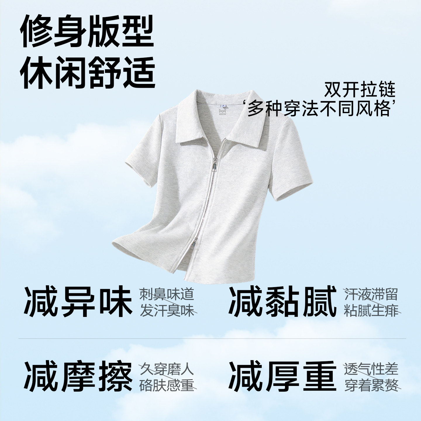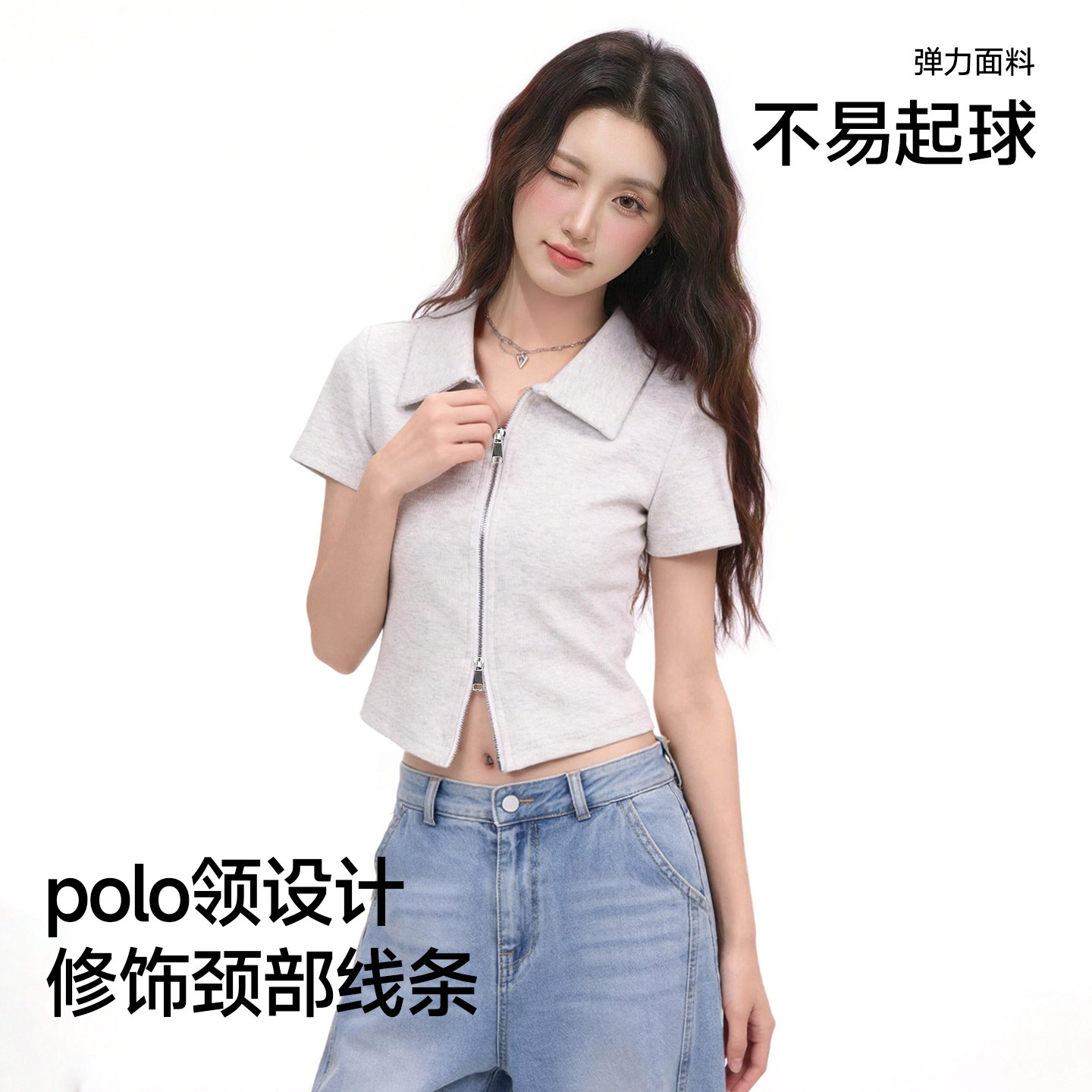 猫人粉色夏新款修身polo领正肩短袖t恤女双拉链短款黑色半袖上衣Z