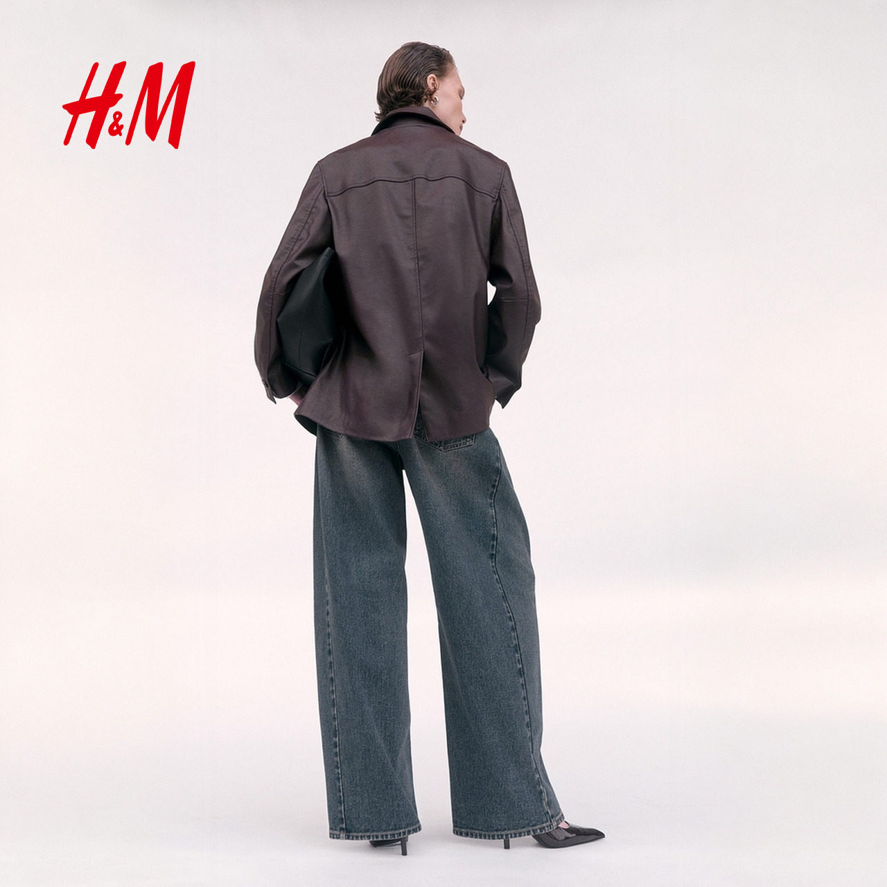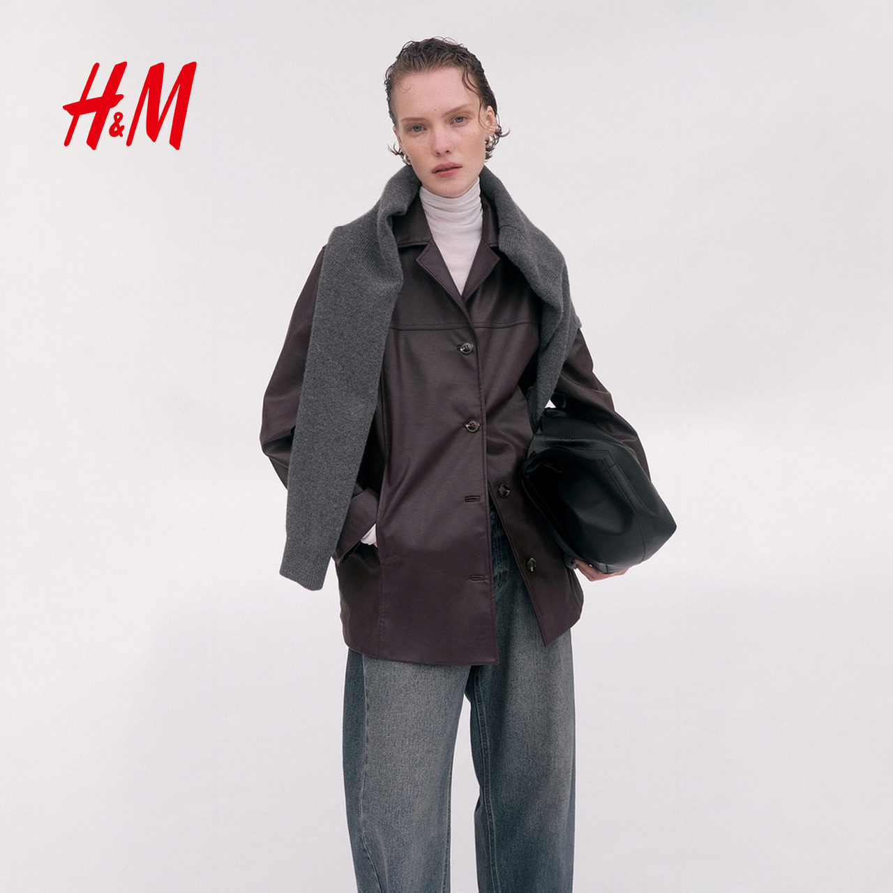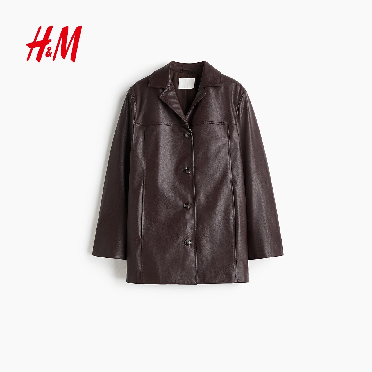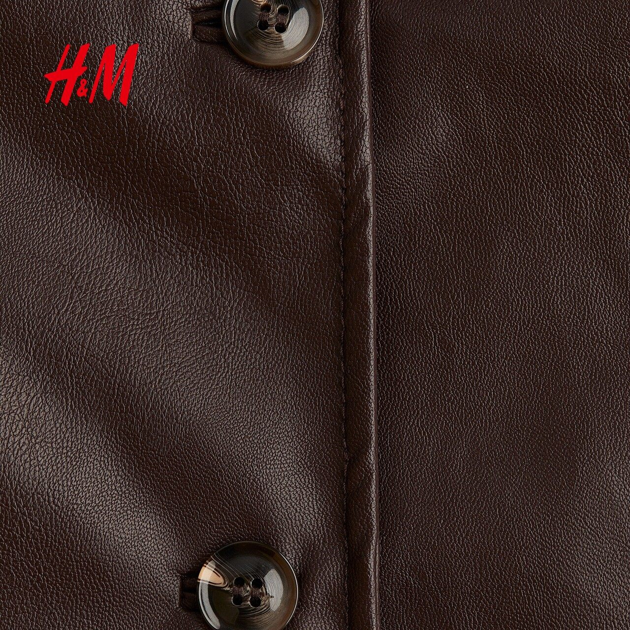 HM女装皮衣冬季涂层时尚修身酒红色纽扣长袖外套1311700