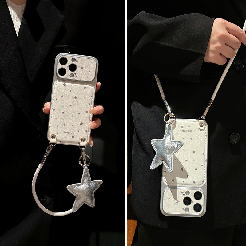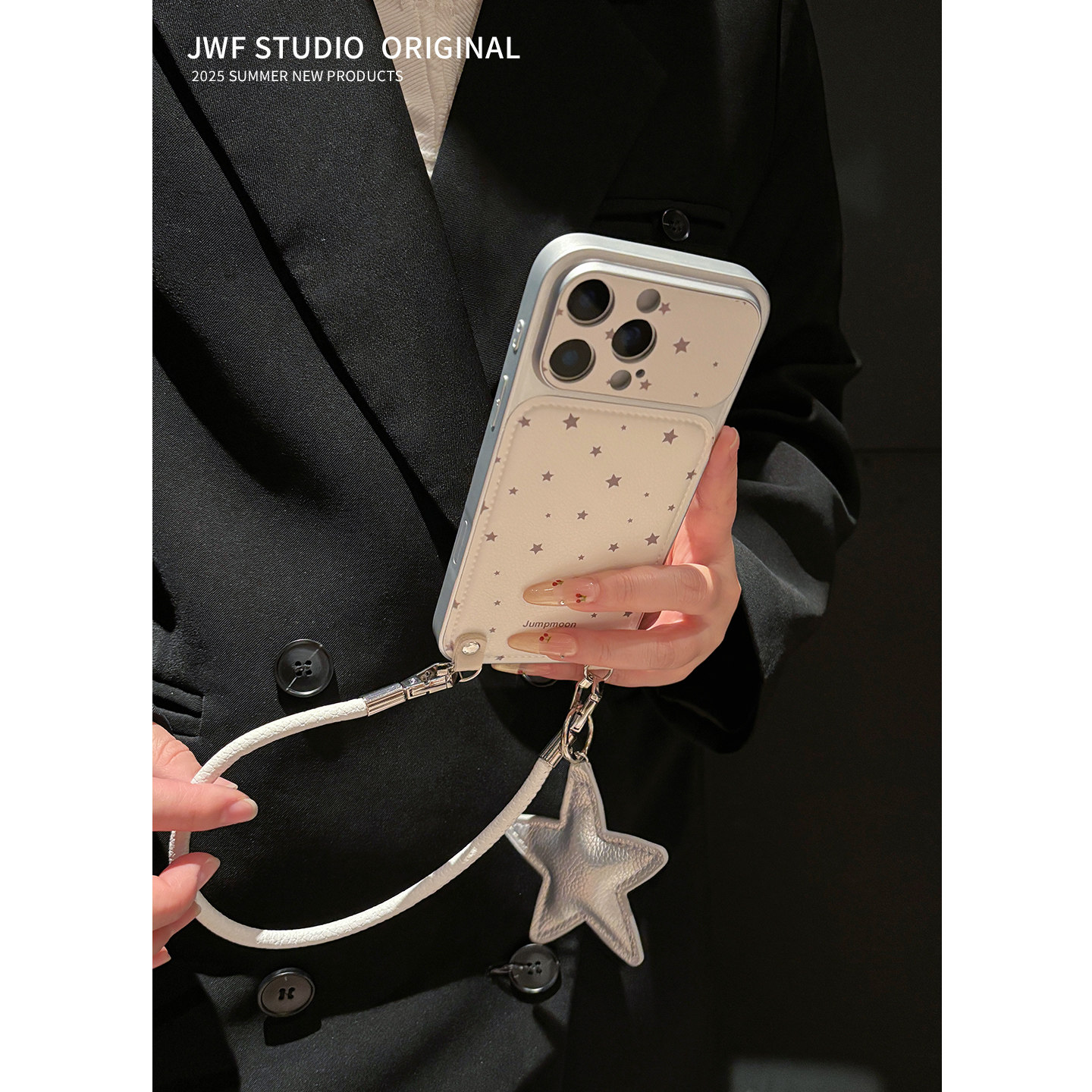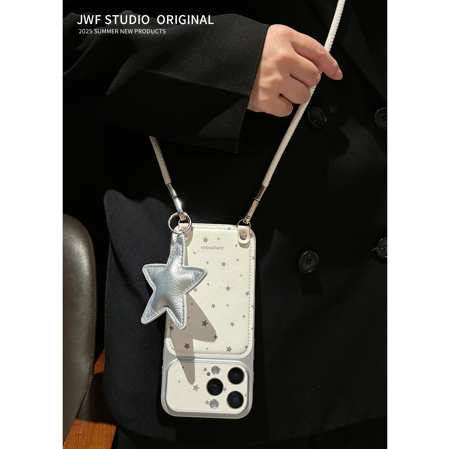 高级感皮纹奶油白简约星星ins日韩17适用17pro苹果17ProMax斜挎手机壳iPhone16全包14女15Promax保护套13挂绳