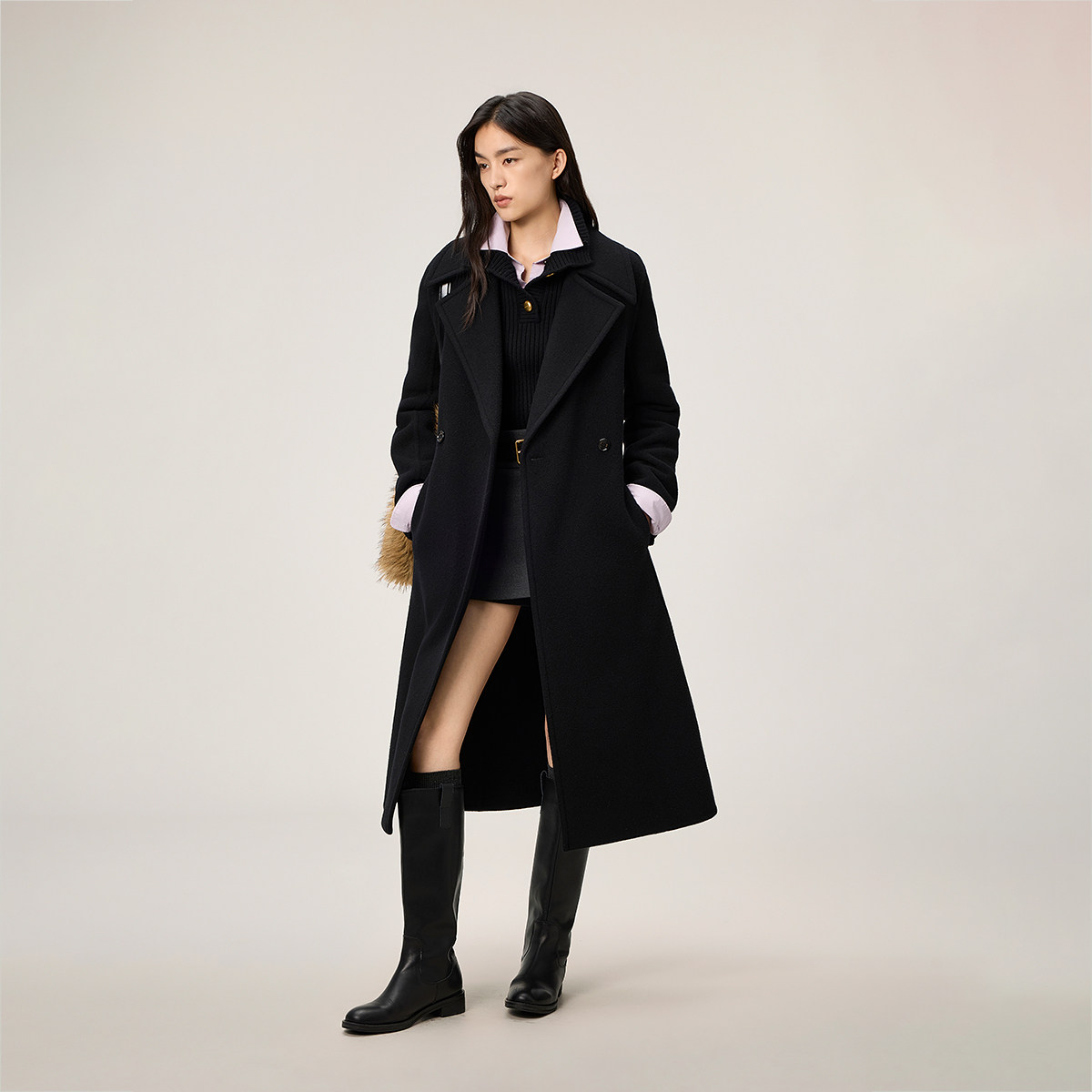 COCOBELLA设计感假两件大翻领毛呢外套女秋冬新款黑色大衣WL0002