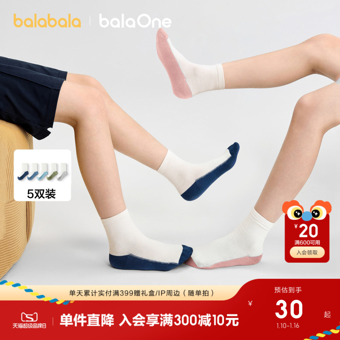 巴拉巴拉儿童袜子春秋男童女童棉袜儿童宝宝中大童学生打底五双装