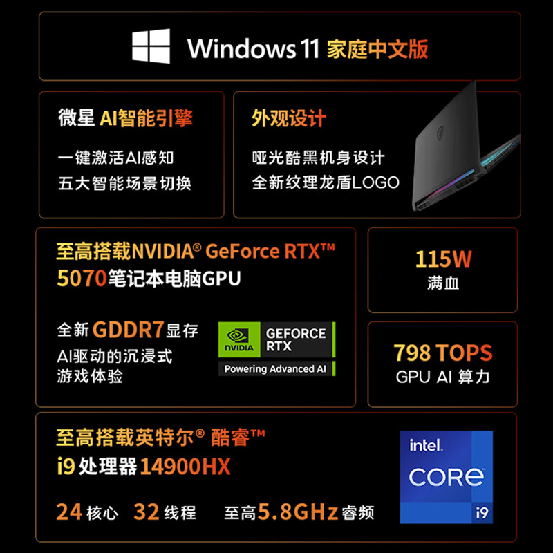 【政府补贴15%】MSI/微星 星影15 i9-14900HX笔记本电脑RTX5070满血显卡15.6英寸2.5K240Hz电竞学生游戏本