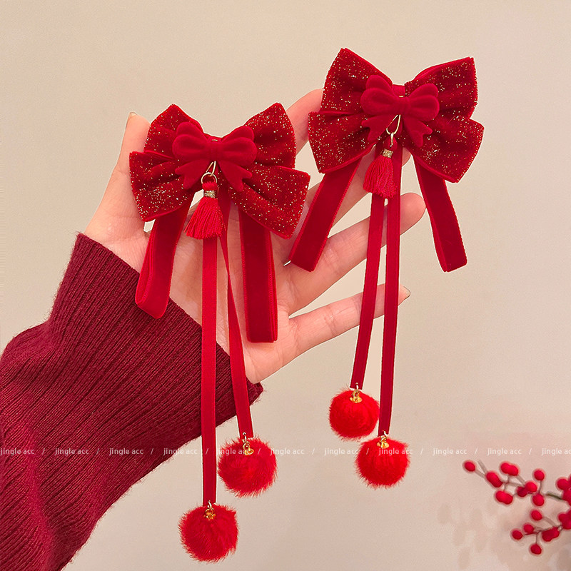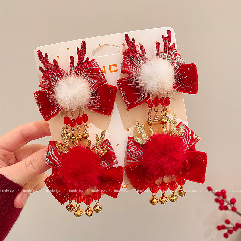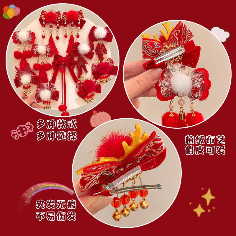新年红色儿童发夹蝴蝶结发饰古风过年头饰中国风女童汉服假发发卡