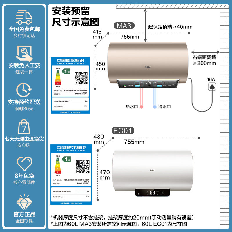 海尔电热水器家用卫生间洗澡速热一级能效节能官方旗舰镁免MA3