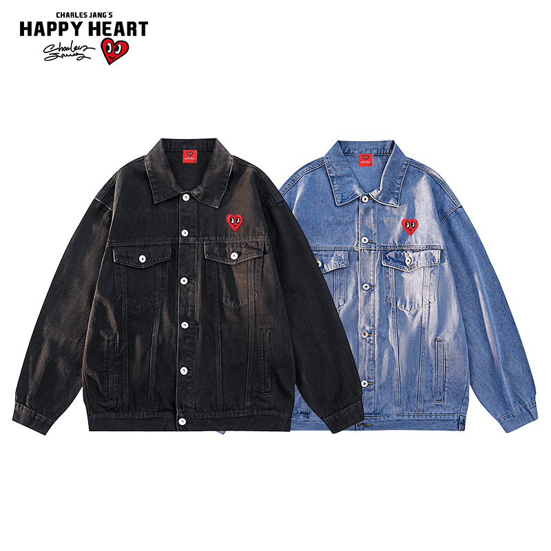查尔斯桃心 美式复古刺绣牛仔外套男春秋季新款翻领百搭痞帅夹克