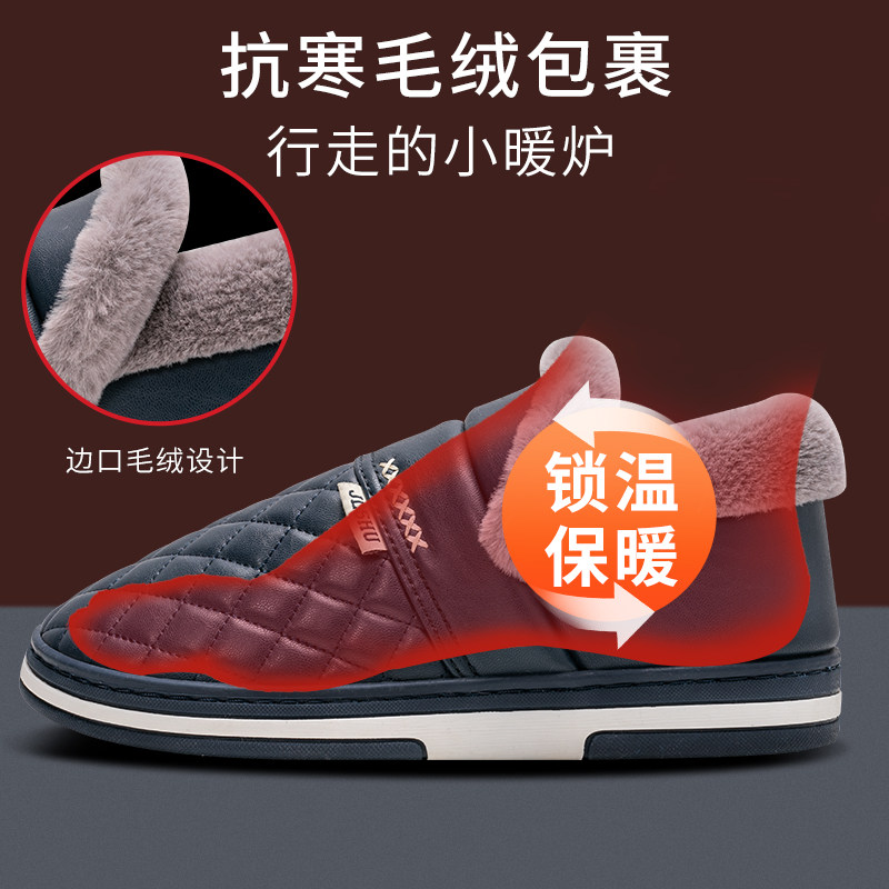 老人棉拖鞋女包跟冬季防水防滑厚底情侣加绒保暖带跟皮面男士棉鞋