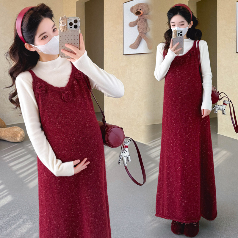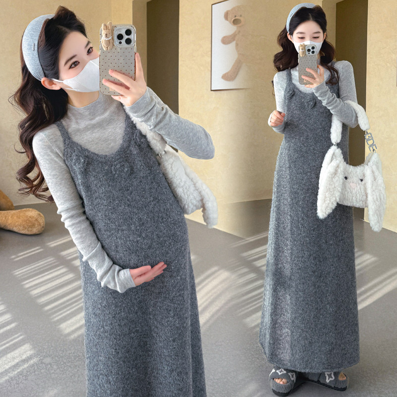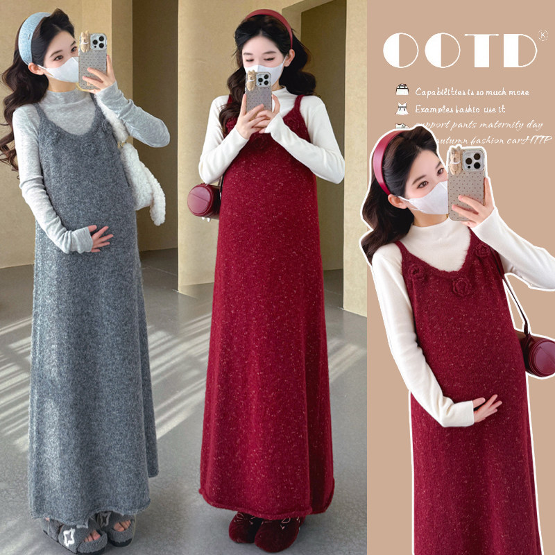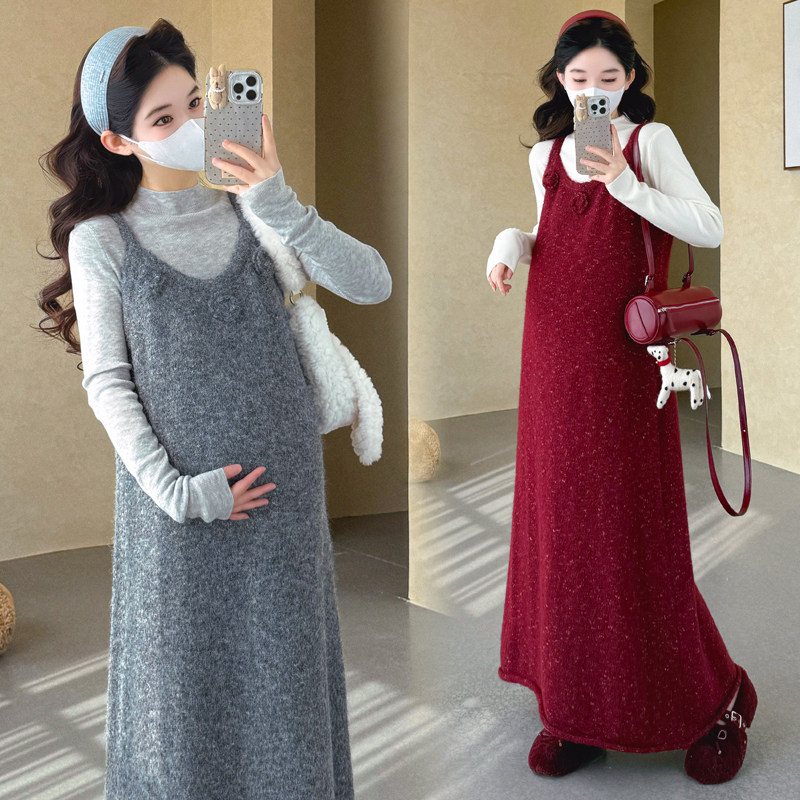 婧麒孕妇装叠穿风针织吊带连衣裙女秋冬长裙大码宽松显瘦女孕妇裙