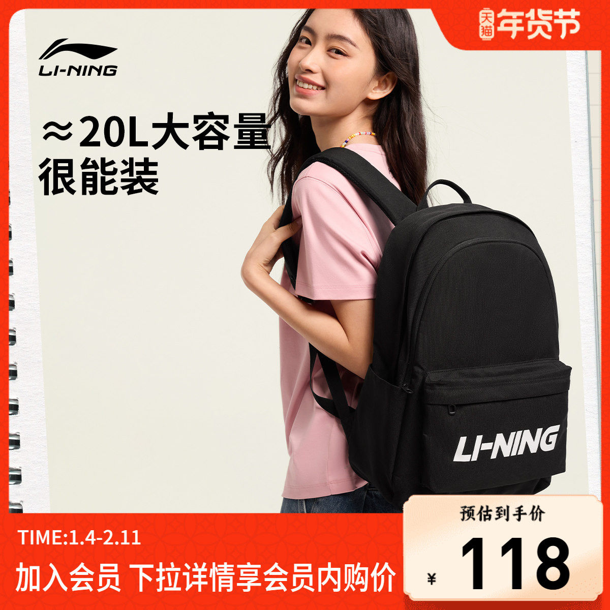 李宁双肩包女包2026新年鸿运穿搭红色通勤休闲运动背包学生书包男